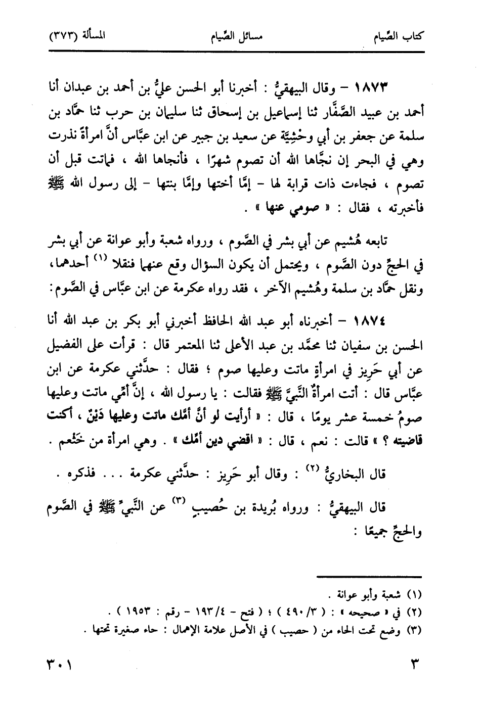 1873 - وقال البيهقيُّ: أخبرنا أبو الحسن عليُّ بن أحمد بن عبدان أنا أحمد بن عبيد الصَّفَّار ثنا إسماعيل بن إسحاق ثنا سليمان بن حرب ثنا حمَّاد بن سلمة عن جعفر بن أبي وحْشِيَّة عن سعيد بن جبير عن ابن عبَّاس أنَّ امرأةً نذرت وهي في البحر إن نجَّاها الله أن تصوم شهرًا، فأنجاها الله، فماتت قبل أن تصوم، فجاءت ذات قرابة لها- إمَّا أختها وإمَّا بنتها- إلى رسول الله صَلَّى اللَّهُ عَلَيْهِ وَسَلَّمَ فأخبرته، فقال: " صومي عنها ".