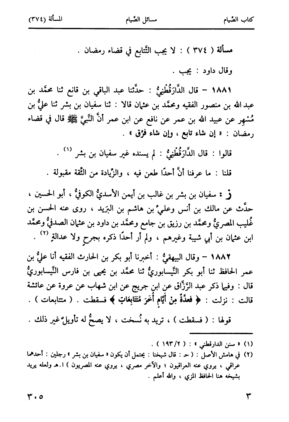 1881 - قال الدَّارَقُطْنِيُّ: حدَّثنا عبد الباقي بن قانع ثنا محمَّد بن عبد الله بن منصور الفقيه ومحمَّد بن عثمان قالا: ثنا سفيان بن بشر ثنا عليُّ بن مُسْهِر عن عبيد الله بن عمر عن نافع عن ابن عمر أنَّ النَّبيَّ صَلَّى اللَّهُ عَلَيْهِ وَسَلَّمَ قال في قضاء رمضان: " إن شاء تابع، وإن شاء فرَّق ".