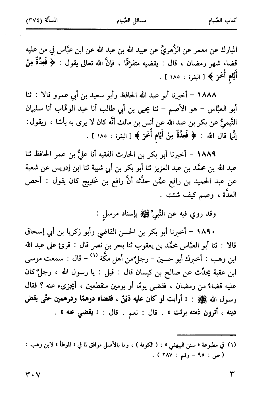 1890 - أخبرنا أبو بكر بن الحسن القاضي وأبو زكريا بن أبي إسحاق قالا: ثنا أبو العبَّاس محمَّد بن يعقوب ثنا بحر بن نصر قال: قرئ على عبد الله ابن وهب: أخبرك أبو حسين- رجلٌ من أهل مكَّة (1) - قال: سمعت موسى ابن عقبة يحدِّث عن صالح بن كيسان قال: قيل: يا رسول الله، رجلٌ كان عليه قضاءٌ من رمضان، فقضى يومًا أو يومين منقطعين، أيجزئ عنه؟ فقال رسول الله صَلَّى اللَّهُ عَلَيْهِ وَسَلَّمَ: " أرأيت لو كان عليه دَيْنٌ، فقضاه درهمًا ودرهمين حتَّى يقض دينه، أترون ذمته برئت ". قال: نعم. قال: " يقضي عنه ".