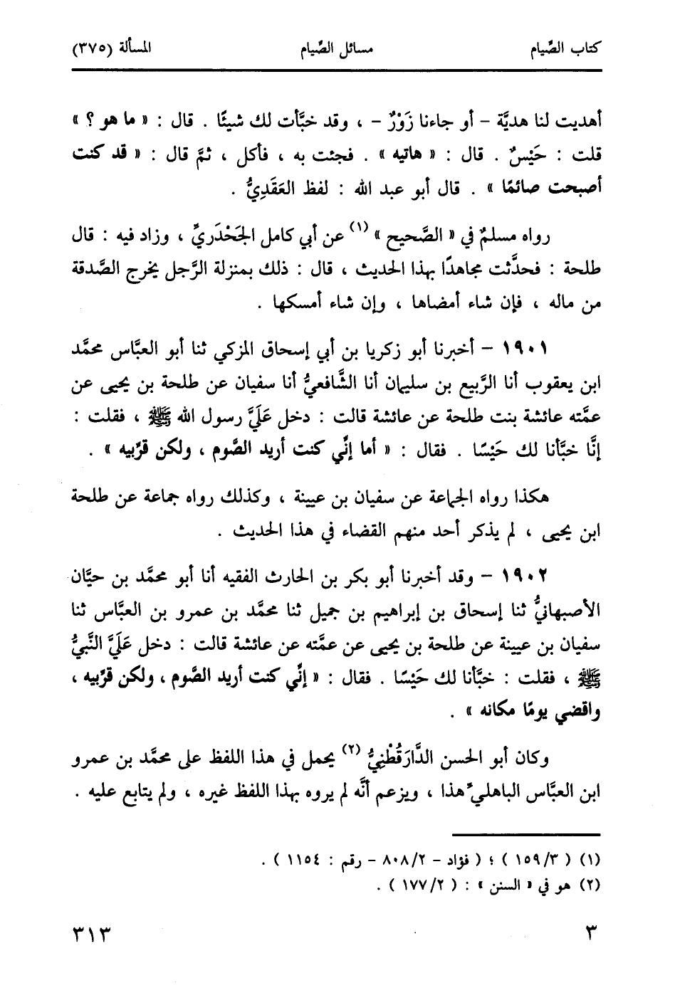 1902 - وقد أخبرنا أبو بكر بن الحارث الفقيه أنا أبو محمَّد بن حيَّان الأصبهانيُّ ثنا إسحاق بن إبراهيم بن جميل ثنا محمَّد بن عمرو بن العبَّاس ثنا سفيان بن عيينة عن طلحة بن يحيى عن عمَّته عن عائشة قالت: دخل عَلَيَّ النَّبيُّ صَلَّى اللَّهُ عَلَيْهِ وَسَلَّمَ، فقلت: خبَّأنا لك حَيْسًا. فقال: " إنِّي كنت أريد الصَّوم، ولكن قرِّبيه، واقضي يومًا مكانه ".