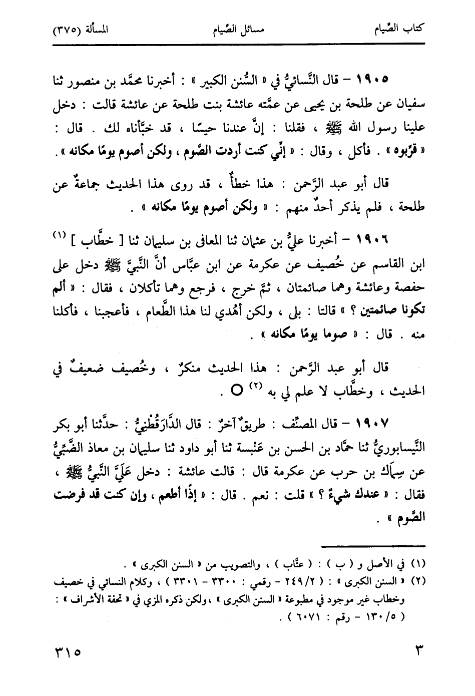 1905 - قال النَّسائيُّ في " السُّنن الكبير ": أخبرنا محمَّد بن منصور ثنا سفيان عن طلحة بن يحيى عن عمَّته عائشة بنت طلحة عن عائشة قالت: دخل علينا رسول الله صَلَّى اللَّهُ عَلَيْهِ وَسَلَّمَ، فقلنا: إنَّ عندنا حيسًا، قد خبَّأناه لك. قال: " قرِّبوه ". فكل، وقال: " إنِّي كنت أردت الصَّوم، ولكن أصوم يومًا مكانه ".