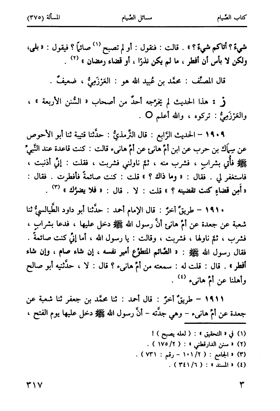 فقال رسول الله صَلَّى اللَّهُ عَلَيْهِ وَسَلَّمَ: " الصَّائم المتطوِّع أمير نفسه، إن شاء صام، وإن شاء أقطر ". قال: قلت له: سمعته من أمِّ هانئ؟ قال: لا، حدَّثنيه أبو صالح وأهلنا عن أمِّ هانئ (4).