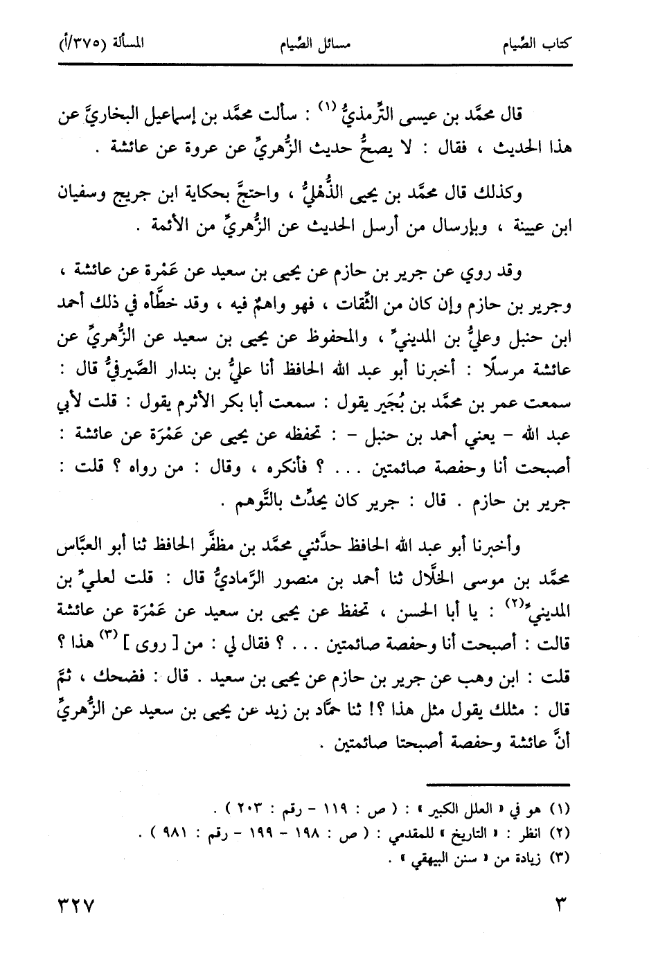 قلت: ابن وهب عن جرير بن حازم عن يحيى بن سعيد. قال: فضحك، ثمَّ قال: مثلك يقول مثل هذا؟! ثنا حمَّاد بن زيد عن يحيى بن سعيد عن الزُّهريِّ أنَّ عائشة وحفصة أصبحتا صائمتين.