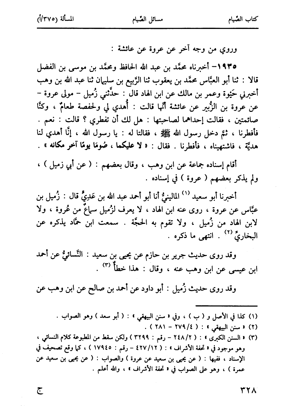 1935 - أخبرناه محمَّد بن عبد الله الحافظ ومحمَّد بن موسى بن الفضل قالا: ثنا أبو العبَّاس محمَّد بن يعقوب ثنا الرَّبيع بن سليمان ثنا عبد الله بن وهب أخبرني حَيْوة وعمر بن مالك عن ابن الهاد قال: حدَّثني زُميل- مولى عروة- عن عروة بن الزُّبير عن عائشة أنَّها قالت: أُهدي لي ولحفصة طعامٌ، وكنَّا صائمتين، فقالت إحداهما لصاحبتها: هل لك أن تفطري؟ قالت: نعم.