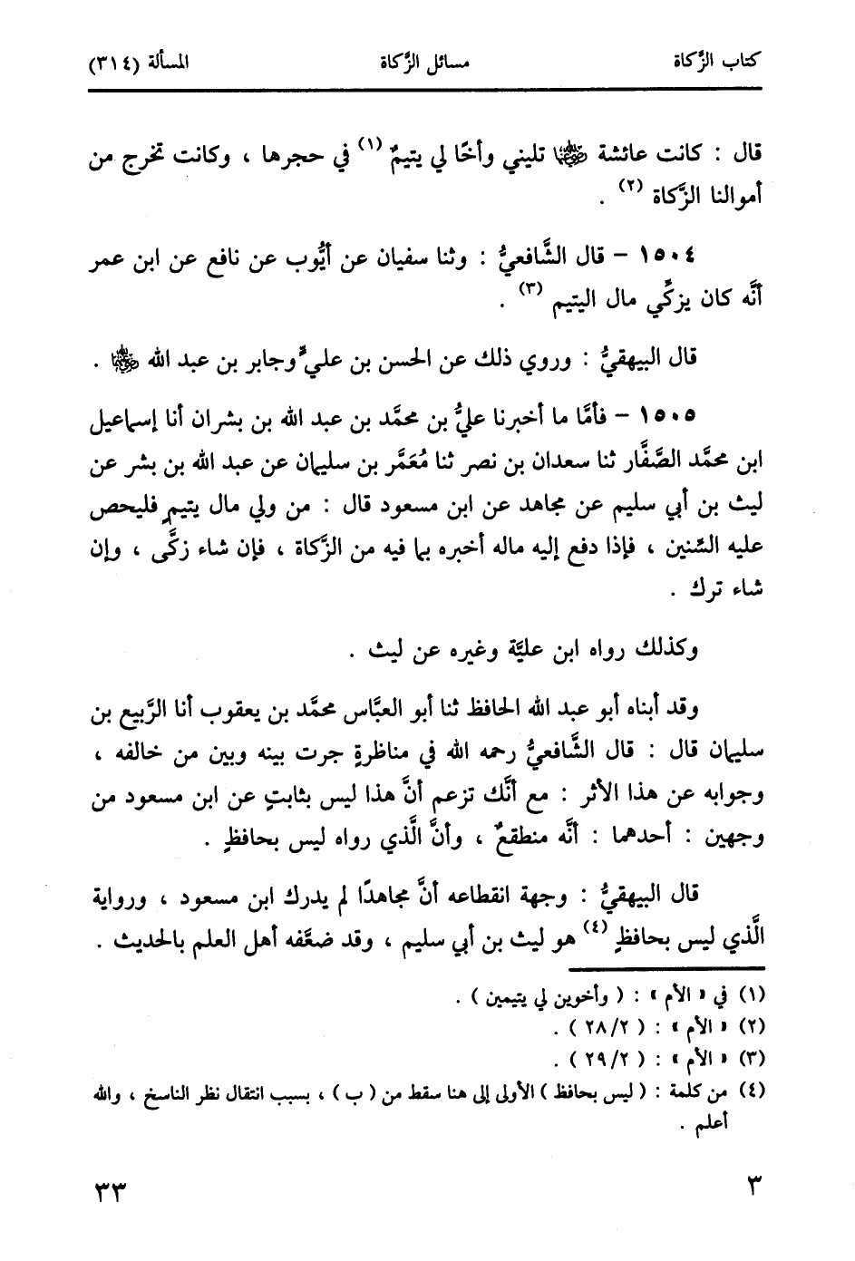 1504 - قال الشَّافعيُّ: وثنا سفيان عن أيُّوب عن نافع عن ابن عمر أنَّه كان يزكِّي مال اليتيم (3).