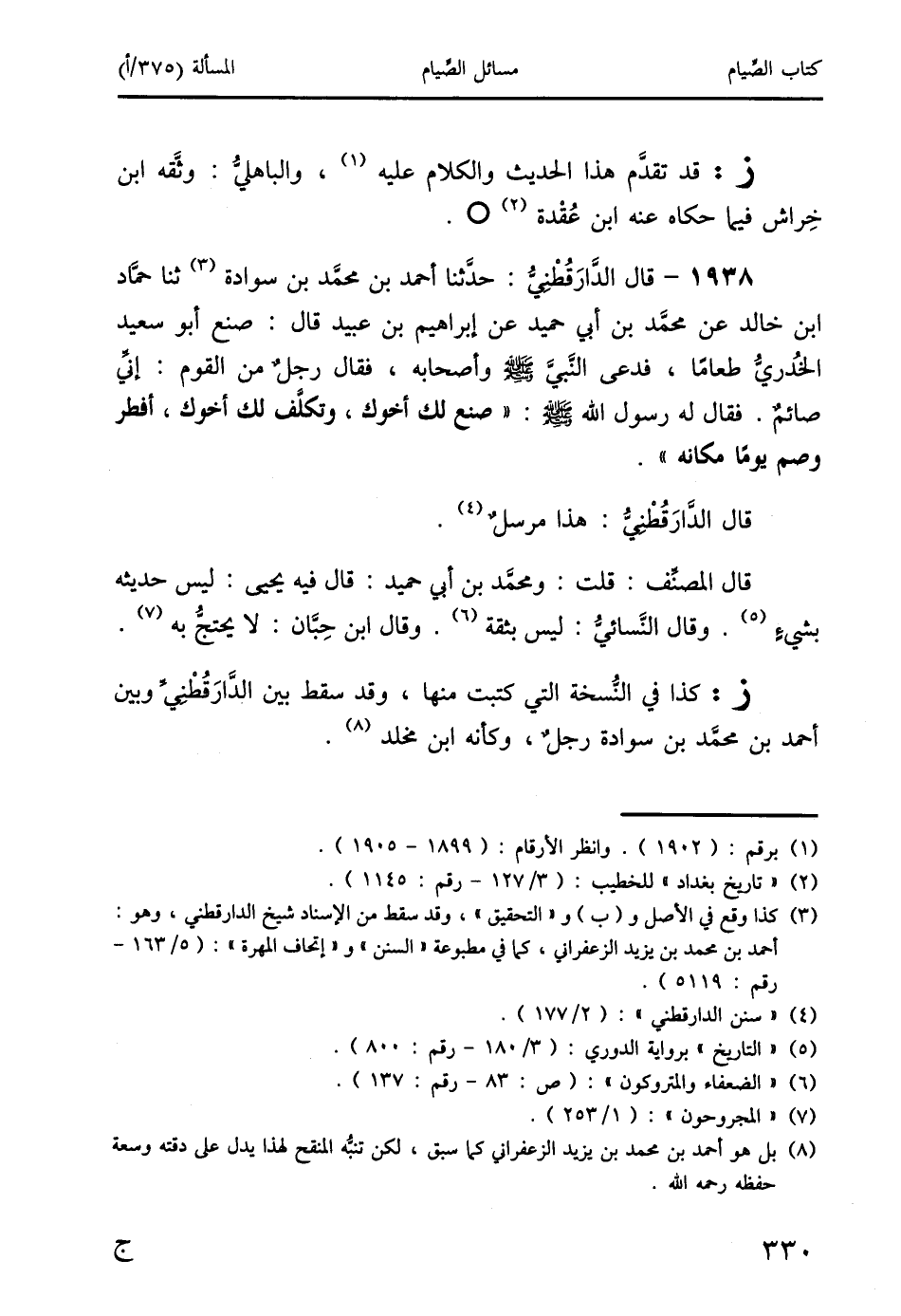 1938 - قال الدَّارَقُطْنِيُّ: حدَّثنا أحمد بن محمَّد بن سوادة (3) ثنا حمَّاد ابن خالد عن محمَّد بن أبي حميد عن إبراهيم بن عبيد قال: صنع أبو سعيد الخُدريُّ طعامًا، فدعى النَّبيَّ صَلَّى اللَّهُ عَلَيْهِ وَسَلَّمَ وأصحابه، فقال رجلٌ من القوم: إنِّي صائمٌ. فقال له رسول الله صَلَّى اللَّهُ عَلَيْهِ وَسَلَّمَ: " صنع لك أخوك، وتكلَّف لك أخوك، أفطر وصم يومًا مكانه ".