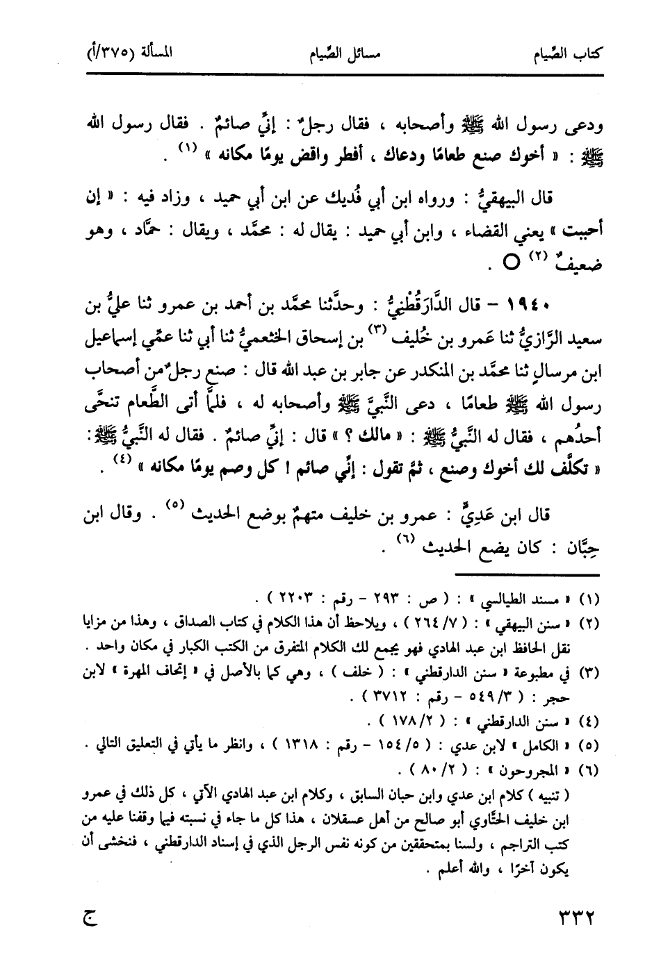 1940 - قال الدَّارَقُطْنِيُّ: وحدَّثنا محمَّد بن أحمد بن عمرو ثنا عليُّ بن سعيد الرَّازيُّ ثنا عَمرو بن خُليف (3) بن إسحاق الخثعميُّ ثنا أبي ثنا عمِّي إسماعيل ابن مرسالٍ ثنا محمَّد بن المنكدر عن جابر بن عبد الله قال: صنع رجلٌ من أصحاب رسول الله صَلَّى اللَّهُ عَلَيْهِ وَسَلَّمَ طعامًا، دعى النَّبيَّ-صَلَّى اللَّهُ عَلَيْهِ وَسَلَّمَ وأصحابه له، فلما أتى الطَّعام تنحَّى أحدُهم، فقال له النَّبيُّ صَلَّى اللَّهُ عَلَيْهِ وَسَلَّمَ: " مالك؟ " قال: إنِّي صائمٌ. فقال له النَّبيُّ صَلَّى اللَّهُ عَلَيْهِ وَسَلَّمَ: " تكلَّف لك أخوك وصنع، ثمَّ تقول: إنِّي صائم! كل وصم يومًا مكانه " (4).