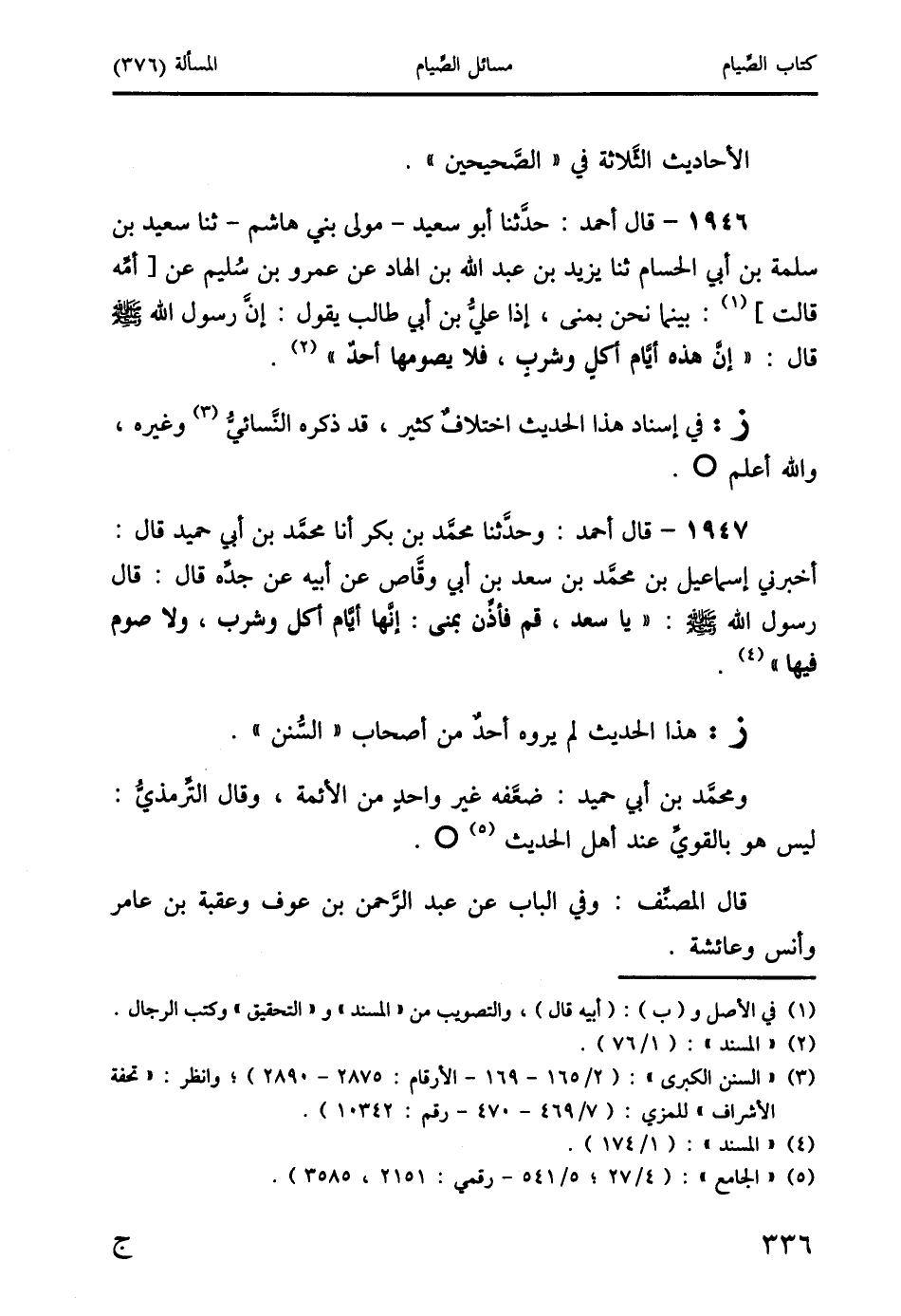 1947 - قال أحمد: وحدَّثنا محمَّد بن بكر أنا محمَّد بن أبي حميد قال: أخبرني إسماعيل بن محمَّد بن سعد بن أبي وقَّاص عن أبيه عن جدِّه قال: قال رسول الله صَلَّى اللَّهُ عَلَيْهِ وَسَلَّمَ: " يا سعد، قم فأذِّن بمنى: إنَّها أيَّام أكل وشرب، ولا صوم فيها" (4).