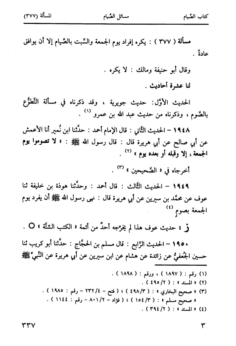 1949 - الحديث الثَّالث: قال أحمد: وحدَّثنا هوذة بن خليفة ثنا عوف عن محمَّد بن سيرين عن أبي هريرة قال: نهى رسول الله صَلَّى اللَّهُ عَلَيْهِ وَسَلَّمَ أن يفرد يوم الجمعة بصومٍ (4)