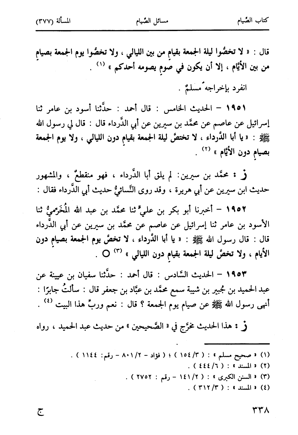 1951 - الحديث الخامس: قال أحمد: حدَّثنا أسود بن عامر ثنا إسرائيل عن عاصم عن محمَّد بن سيربن عن أبي الدَّرداء قال: قال لي رسول الله صَلَّى اللَّهُ عَلَيْهِ وَسَلَّمَ: " يا أبا الدَّرداء، لا تختصَّ ليلة الجمعة بقيامٍ دون الليالي، ولا يوم الجمعة بصيامٍ دون الأيَّام " (2).