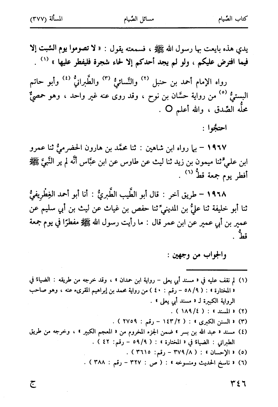 1967 - بما رواه ابن شاهين: ثنا محمَّد بن هارون الحضرميُّ ثنا عمرو ابن عليٍّ ثنا ميمون بن زيد ثنا ليث عن طاوس عن ابن عبَّاس أنَّه لم ير النَّبيَّ صَلَّى اللَّهُ عَلَيْهِ وَسَلَّمَ أفطر يوم جمعة قطُّ (6).