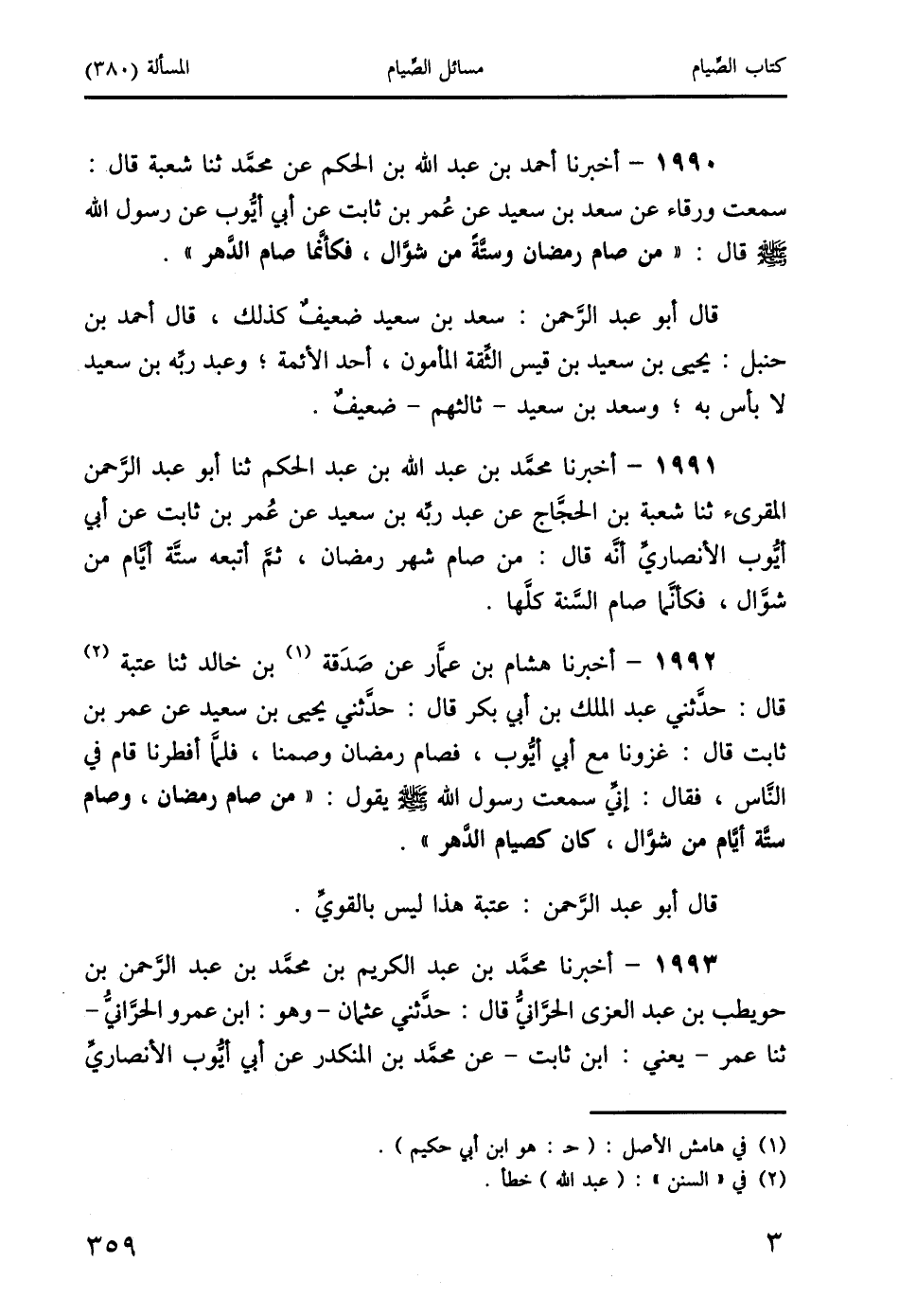 1991 - أخبرنا محمَّد بن عبد الله بن عبد الحكم ثنا أبو عبد الرَّحمن المقرئ ثنا شعبة بن الحجَّاج عن عبد ربِّه بن سعيد عن عُمر بن ثابت عن أبي أيُّوب الأنصاريِّ أنَّه قال: من صام شهر رمضان، ثمَّ أتبعه ستَّة أيَّام من شوَّال، فكأنَّما صام السَّنة كلَّها.