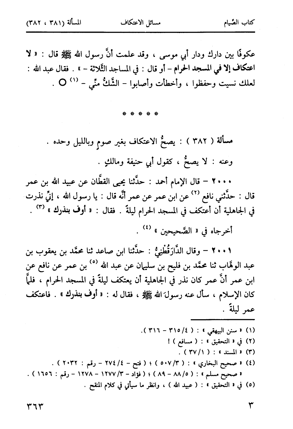 2001 - وقال الدَّارَقُطْنِيُّ: حدَّثنا ابن صاعد ثنا محمَّد بن يعقوب بن عبد الوهَّاب ثنا محمَّد بن فليح بن سليمان عن عبد الله (5) بن عمر عن نافع عن ابن عمر أنَّ عمر كان نذر في الجاهلية أن يعتكف ليلةً في المسجد الحرام، فلمَّا كان الإسلام، سأل عنه رسولَ الله صَلَّى اللَّهُ عَلَيْهِ وَسَلَّمَ، فقال له: " أوف بنذرك ". فاعتكف عمر ليلةً.