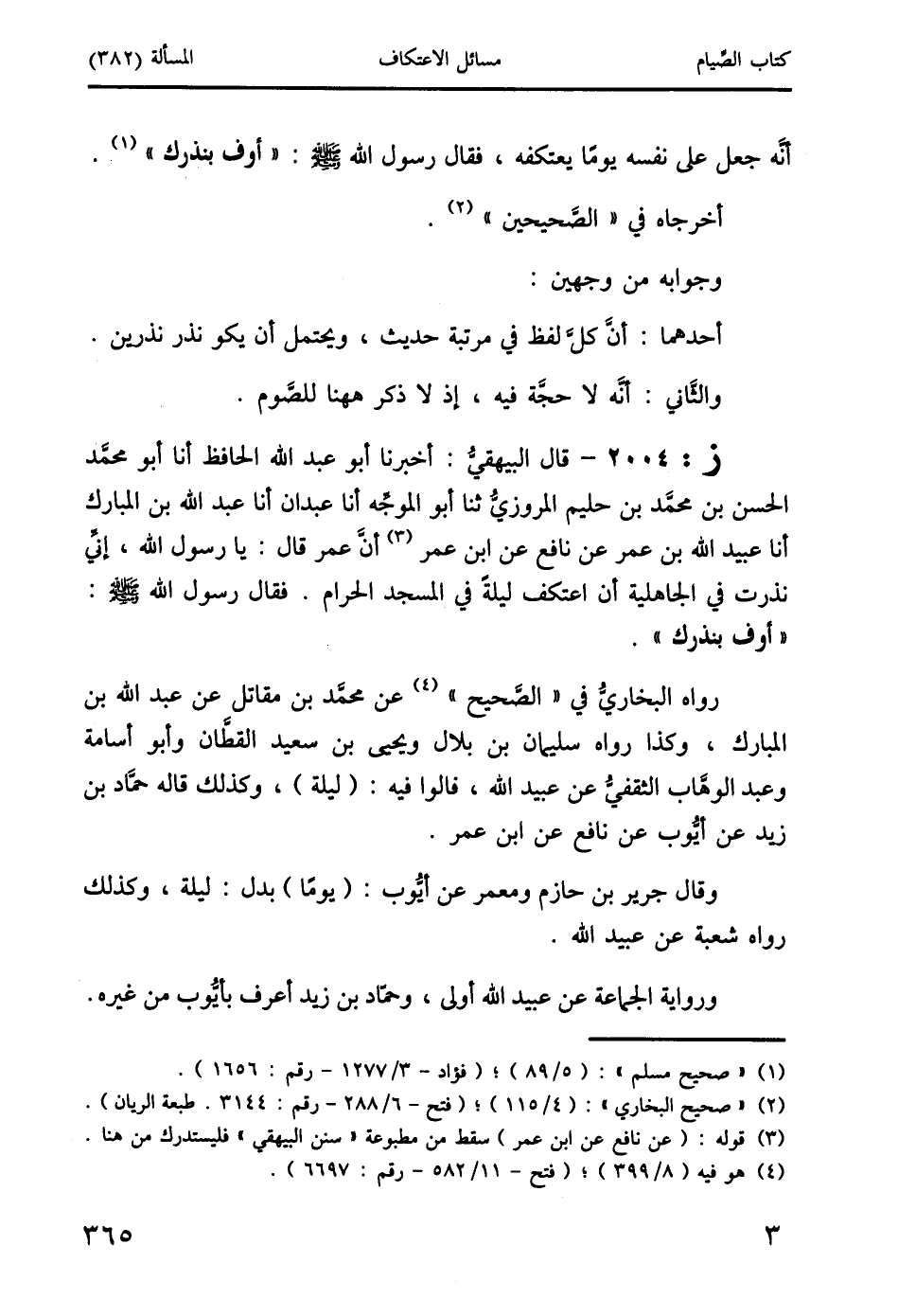 ز: 2004 - قال البيهقيُّ: أخبرنا أبو عبد الله الحافظ أنا أبو محمَّد الحسن بن محمَّد بن حليم المروزيُّ ثنا أبو الموجِّه أنا عبدان أنا عبد الله بن المبارك أنا عبيد الله بن عمر عن نافع عن ابن عمر (3) أنَّ عمر قال: يا رسول الله، إنِّي نذرت في الجاهلية أن اعتكف ليلةً في المسجد الحرام. فقال رسول الله صَلَّى اللَّهُ عَلَيْهِ وَسَلَّمَ: " أوف بنذرك ".
