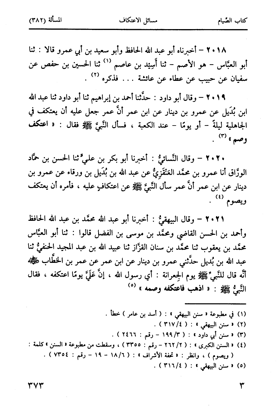 2020 - وقال النَّسائيُّ: أخبرنا أبو بكر بن عليٍّ ثنا الحسن بن حمَّاد الورَّاق أنا عمرو بن محمَّد العَنْقَزِيُّ عن عبد الله بن بُدَيل بن ورقاء عن عمرو بن دينار عن ابن عمر أنَّ عمر سأل النَّبيَّ-صَلَّى اللَّهُ عَلَيْهِ وَسَلَّمَ عن اعتكافٍ عليه، فأمره أن يعتكف ويصوم (4).