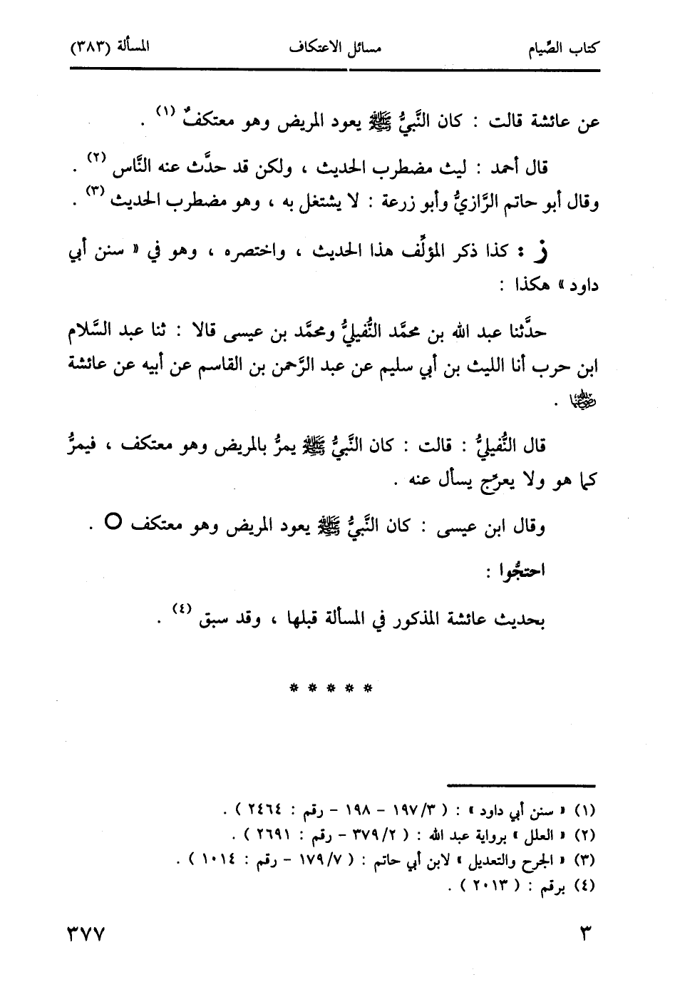 قال النُّفيليُّ: قالت: كان النَّبيُّ صَلَّى اللَّهُ عَلَيْهِ وَسَلَّمَ يمرُّ بالمريض وهو معتكف، فيمرُّ كما هو ولا يعرِّج يسأل عنه.