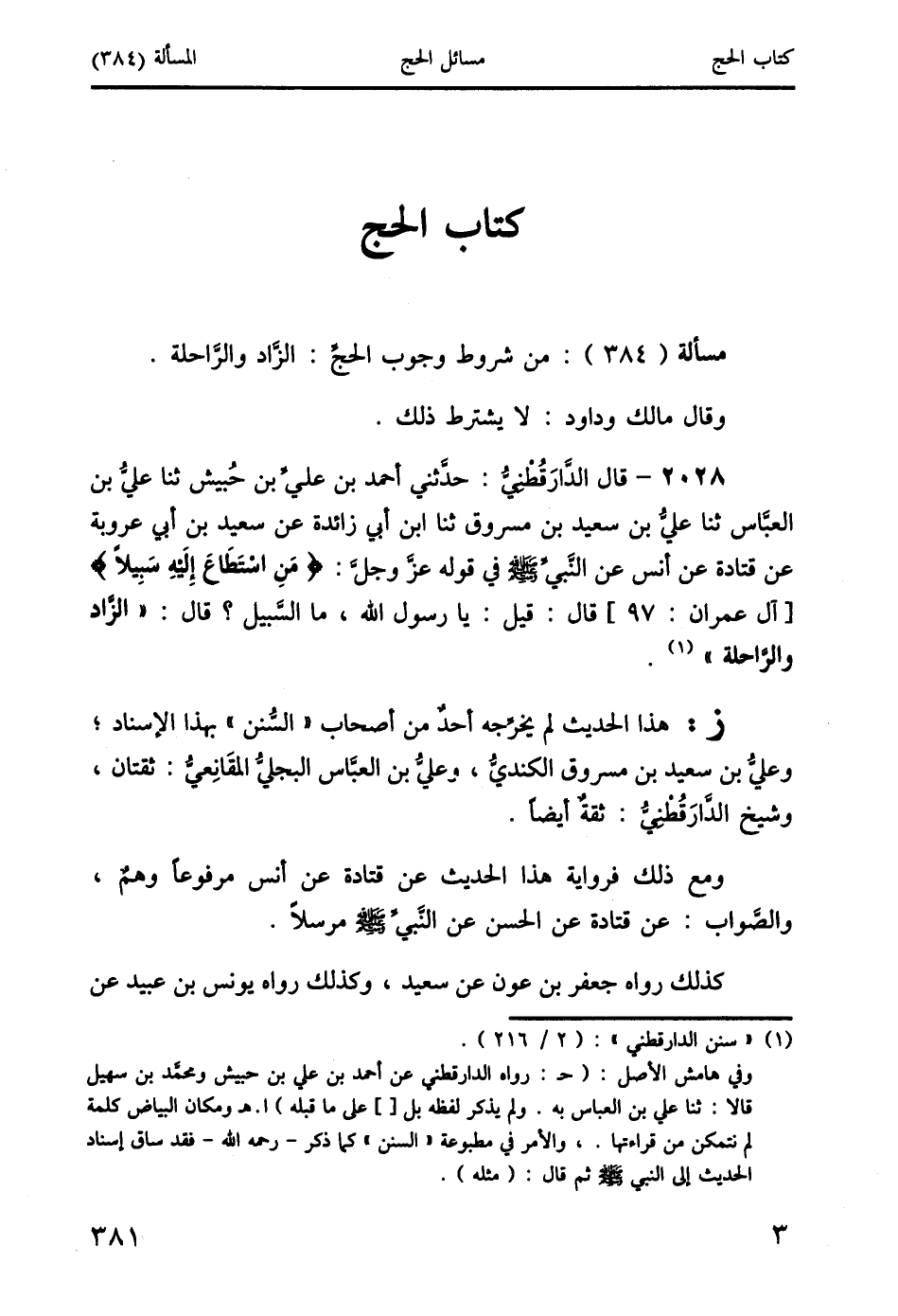 2028 - قال الدَّارَقُطْنِيُّ: حدَّثني أحمد بن عليِّ بن حُبيش ثنا عليُّ بن العبَّاس ثنا عليُّ بن سعيد بن مسروق ثنا ابن أبي زائدة عن سعيد بن أبي عروبة عن قتادة عن أنس عن النَّبيِّ صَلَّى اللَّهُ عَلَيْهِ وَسَلَّمَ في قوله عزَّ وجلَّ: {مَنِ اسْتَطَاعَ إِلَيْهِ سَبِيلاً} [آل عمران: 97] قال: قيل: يا رسول الله، ما السَّبيل؟ قال: " الزَّاد والرَّاحلة " (1).