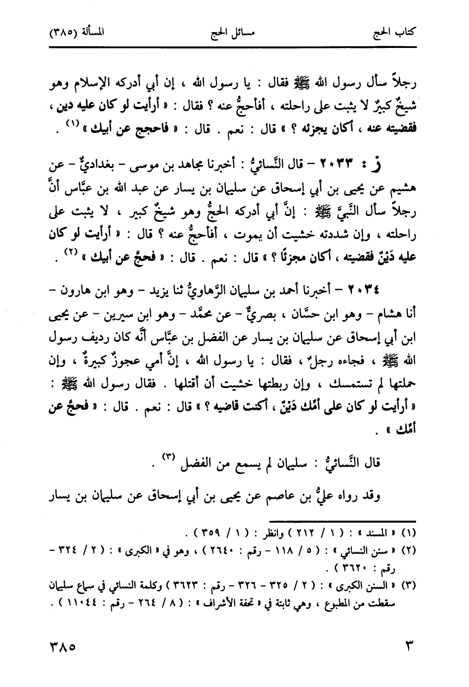 ز: 2033 - قال النَّسائيُّ: أخبرنا مجاهد بن موسى- بغداديُّ- عن هشيم عن يحيى بن أبي إسحاق عن سليمان بن يسار عن عبد الله بن عبَّاس أنَّ رجلاً سأل النَّبيَّ صَلَّى اللَّهُ عَلَيْهِ وَسَلَّمَ: إنَّ أبي أدركه الحجُّ وهو شيخٌ كبير، لا يثبت على راحلته، وإن شددته خشيت أن يموت، أفأحجُّ عنه؟ قال: " أرأيت لو كان عليه دَيْنٌ فقضيته، أكان مجزئًا؟ " قال: نعم. قال: " فحجَّ عن أبيك " (2).