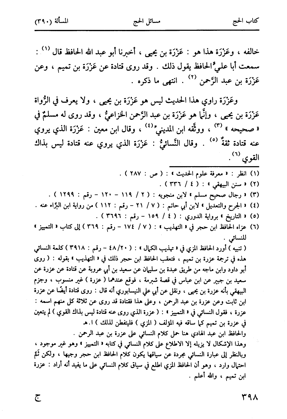 (تنبيه) أورد الحافظ المزي في "تهذيب الكمال": (20/ 48 - رقم: 3918) كلمة النسائي هذه في ترجمة عزرة بن تميم، فتعقب الحافظ ابن حجر ذلك في "التهذيب" بقوله: (روى أبو داود وابن ماجة من طريق عبدة بن سليمان عن سعد بن أبي عروبة عن قتادة عن عزرة عن سعيد بن جبير عن ابن عبَّاس في قصة شبرمة، فوقع عندهما (عزرة) غير منسوب، وجزم البيهقي بأنه عزرة بن يحيى، ونقل عن أبي علي النيسابوري أنه قال: روى قتادة أيضًا عن عزرة ابن ثابت وعن عزرة بن عبد الرحمن، وعلى هذا فقتادة قد روى عن ثلاثة كل منهم اسمه: عزرة، فقول النسائي في " التمييز ": (عزرة الذي روى عنه قتادة ليس بذاك القوي) لم يتعين في عزرة بن نميم كما ساقه فيه المؤلف (المزي) فليتفطن لذلك) ا. هـ والحافظ ابن عبد الهادي هنا حمل كلام النسائي على عزرة بن عبد الرحمن.