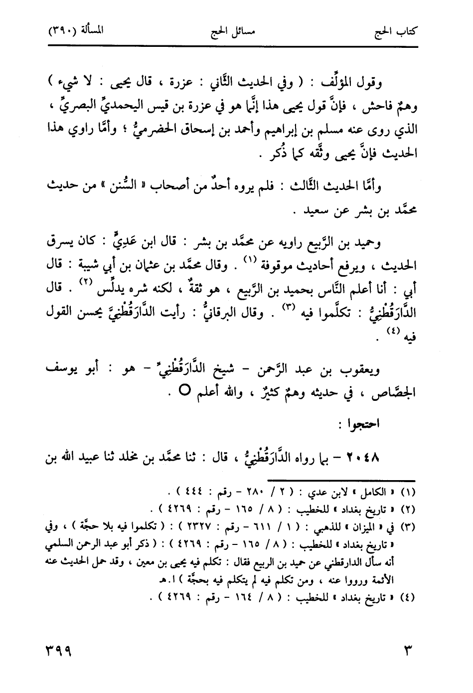 (3) في "الميزان" للذهبي: (1/ 611 - رقم: 2327): (تكلموا فيه بلا حجَّة)، وفي "تاريخ بغداد" للخطيب: (8/ 165 - رقم: 4269): (ذكر أبو عبد الرحمن السلمي أنه سأل الدارقطني عن حميد بن الربيع فقال: تكلم فيه يحيى بن معين، وقد حمل الحديث عنه الأئمة ورووا عنه، ومن تكلم فيه لم يتكلم فيه بحجَّة) ا. هـ