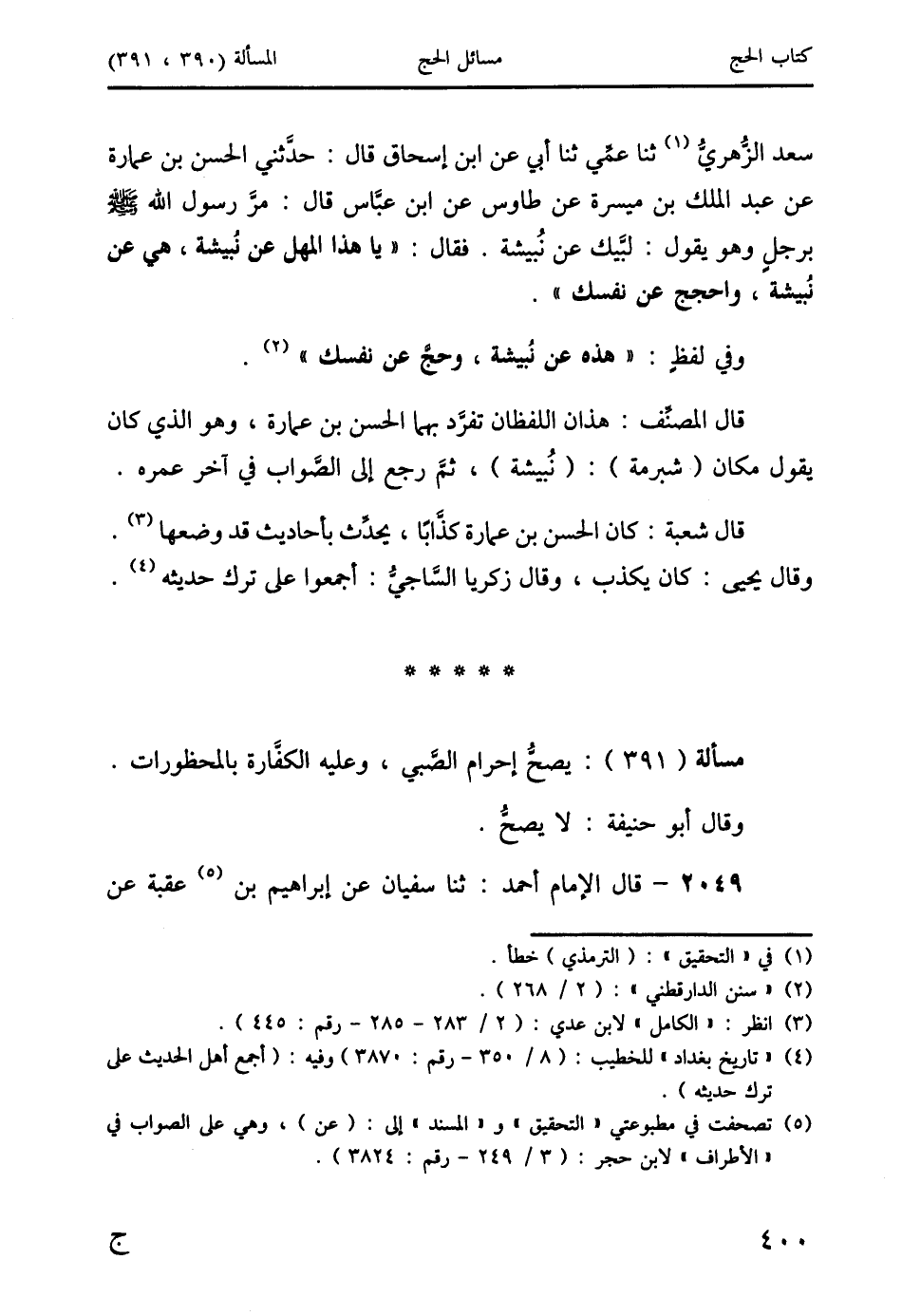 سعد الزُّهريُّ (1) ثنا عمِّي ثنا أبي عن ابن إسحاق قال: حدَّثني الحسن بن عمارة عن عبد الملك بن ميسرة عن طاوس عن ابن عبَّاس قال: مرَّ رسول الله صَلَّى اللَّهُ عَلَيْهِ وَسَلَّمَ برجلٍ وهو يقول: لبَّيك عن نُبيشة. فقال: " يا هذا المهل عن نُبيشة، هي عن نُبيشة، واحجج عن نفسك ".