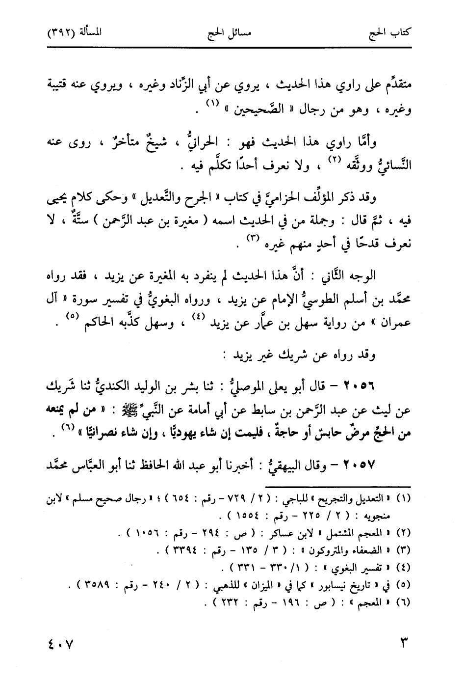 2056 - قال أبو يعلى الموصليُّ: ثنا بشر بن الوليد الكنديُّ ثنا شَريك عن ليث عن عبد الرَّحمن بن سابط عن أبي أمامة عن النَّبيِّ صَلَّى اللَّهُ عَلَيْهِ وَسَلَّمَ: " من لم يمنعه من الحجِّ مرضٌ حابسٌ أو حاجةٌ، فليمت إن شاء يهوديًّا، وإن شاء نصرانيًّا " (6).