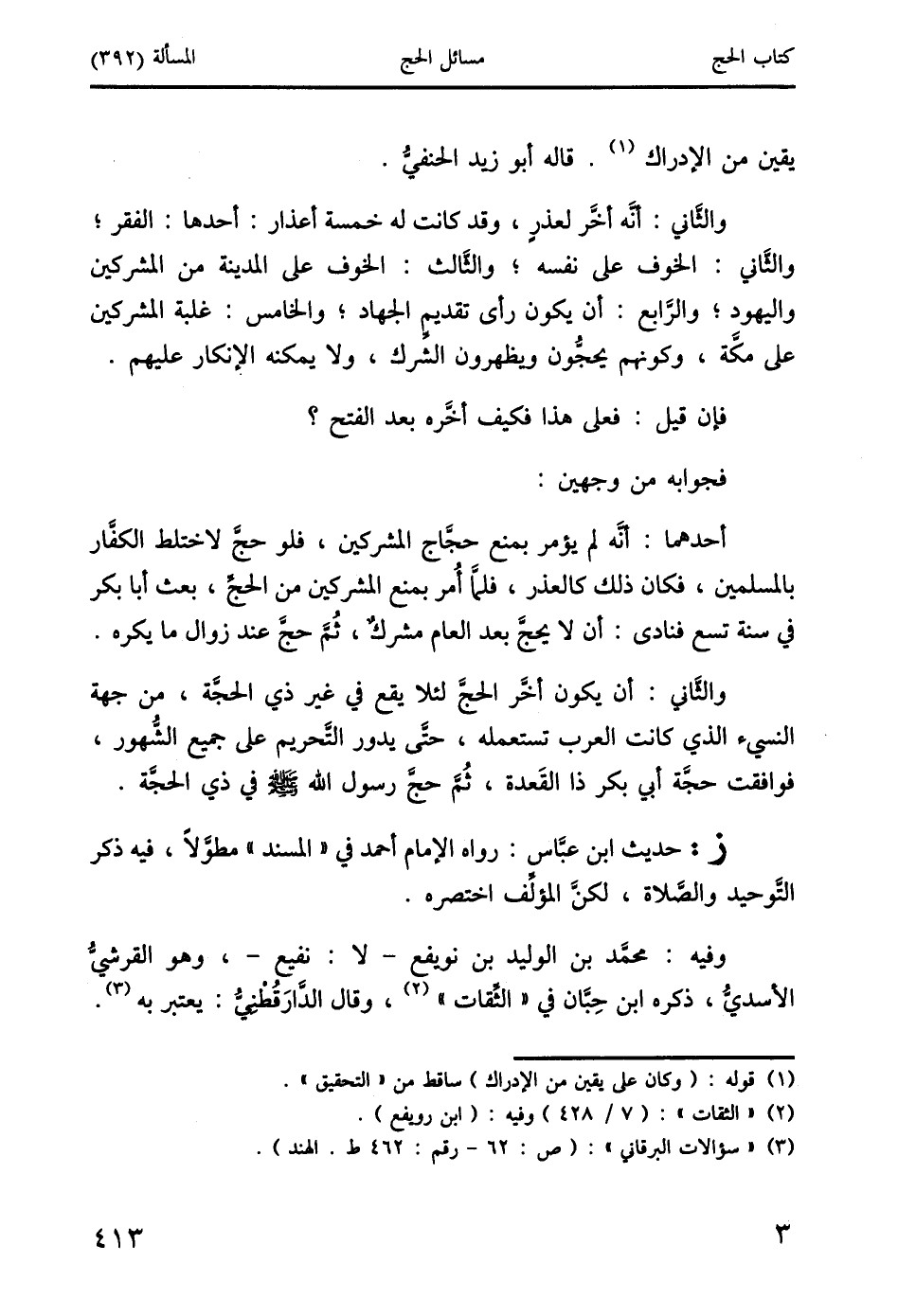 والثَّاني: أنَّه أخَّر لعذرٍ، وقد كانت له خمسة أعذار: أحدها: الفقر؛ والثَّاني: الخوف على نفسه؛ والثَّالث: الخوف على المدينة من المشركين واليهود؛ والرَّابع: أن يكون رأى تقديم الجهاد؛ والخامس: غلبة المشركين على مكَّة، وكونهم يحجُّون ويظهرون الشِّرك، ولا يمكنه الإنكار عليهم.