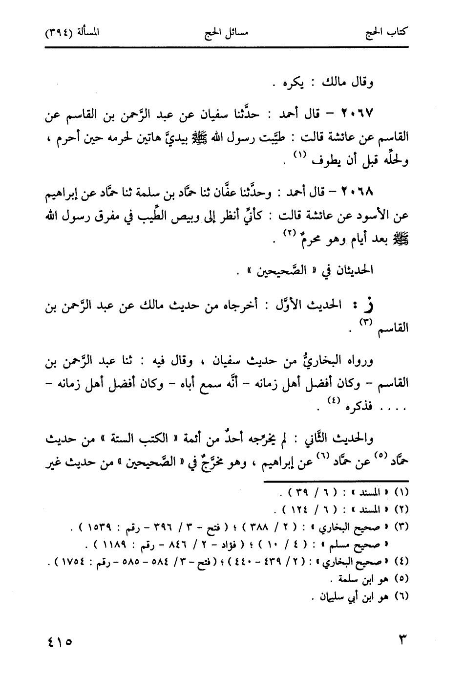 القاسم عن عائشة قالت: طيَّبت رسول الله صَلَّى اللَّهُ عَلَيْهِ وَسَلَّمَ بيديَّ هاتن لحرمه حين أحرم،