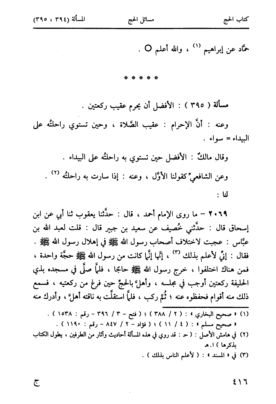 مسألة (395): الأفضل أن يحرم عقيب ركعتين.