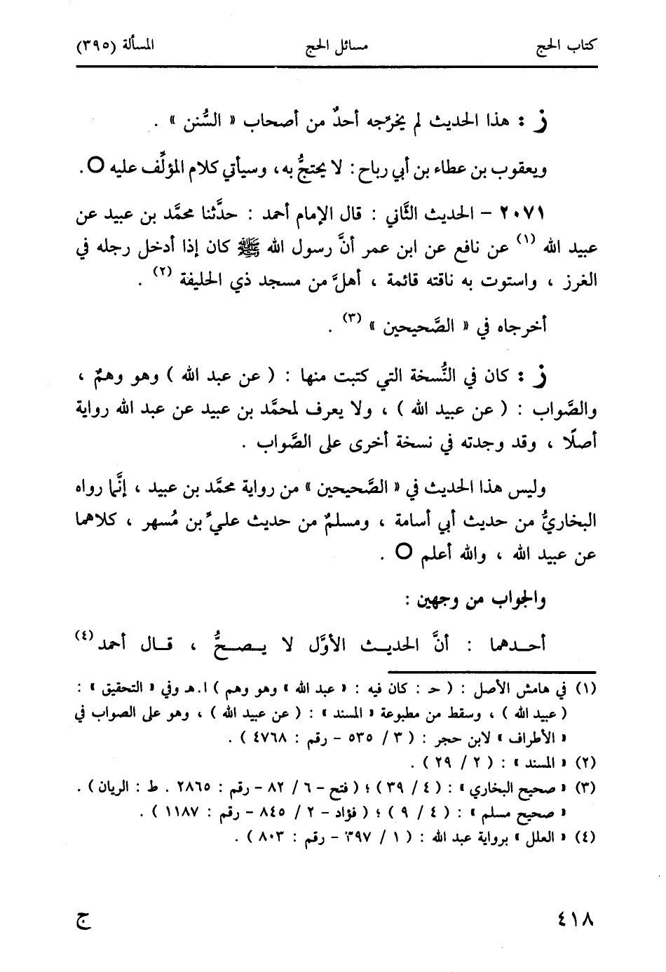 ز: كان في النُّسخة التي كتبت منها: (عن عبد الله) وهو وهمٌ، والصَّواب: (عن عبيد الله)، ولا يعرف لمحمَّد بن عبيد عن عبد الله رواية أصلاً، وقد وجدته في نسخة أخرى على الصَّواب.