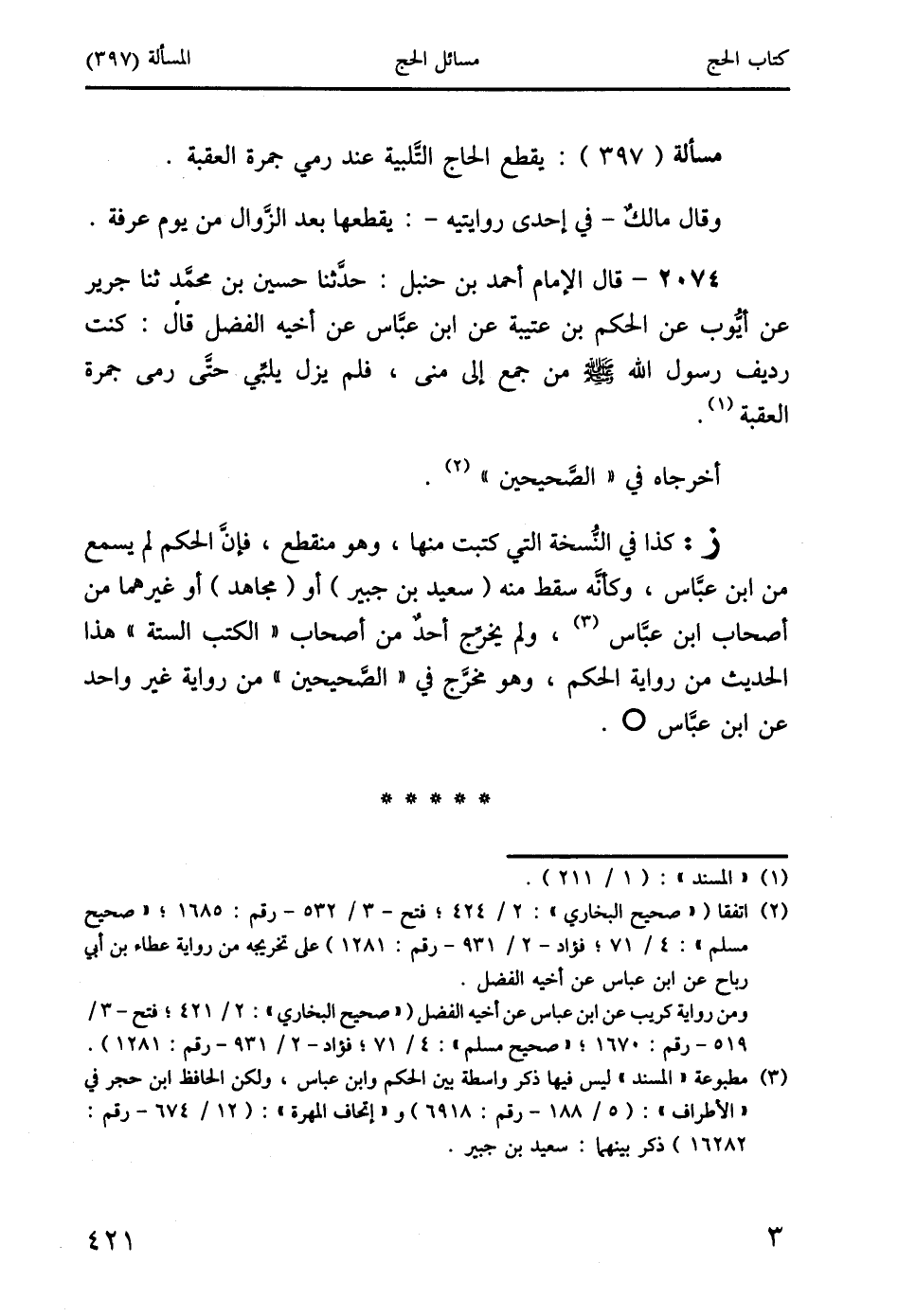 ز: كذا في النُّسخة التي كتبت منها، وهو منقطع، فإنَّ الحكم لم يسمع من ابن عبَّاس، وكأنَّه سقط منه (سعيد بن جبير) أو (مجاهد) أو غيرهما من أصحاب ابن عبَّاس (3)، ولم يخرِّج أحدٌ من أصحاب " الكتب الستة " هذا