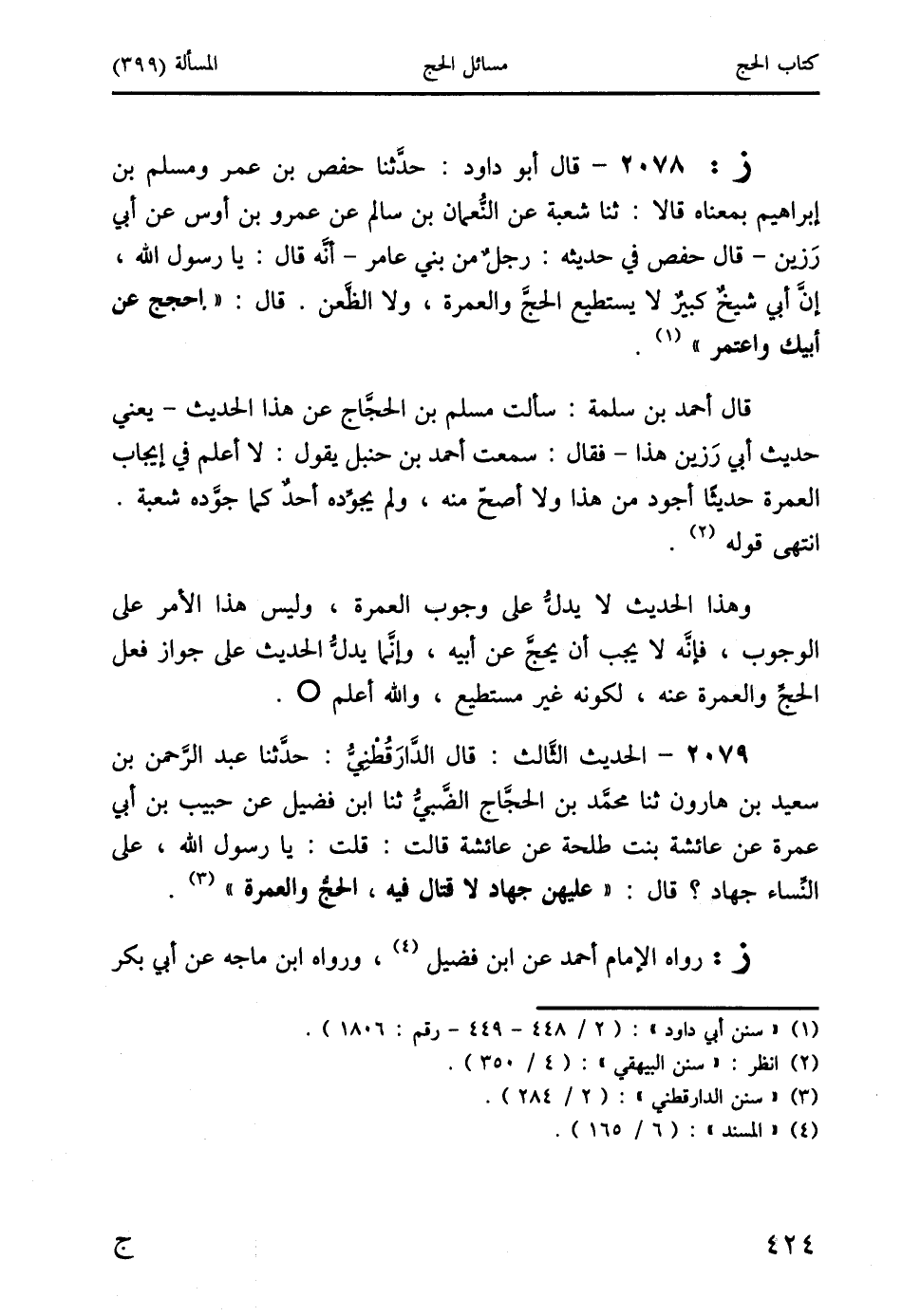 2079 - الحديث الثَّالث: قال الدَّارَقُطْنِيُّ: حدَّثنا عبد الرَّحمن بن سعيد بن هارون ثنا محمَّد بن الحجَّاج الضَّبيُّ ثنا ابن فضيل عن حبيب بن أبي عمرة عن عائشة بنت طلحة عن عائشة قالت: قلت: يا رسول الله، على النِّساء جهاد؟ قال: " عليهن جهاد لا قتال فيه، الحجُّ والعمرة " (3).