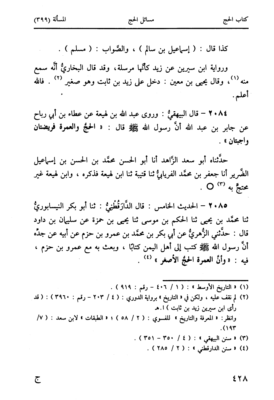 أنَّ رسول الله صَلَّى اللَّهُ عَلَيْهِ وَسَلَّمَ كتب إلى أهل اليمن كتابًا، وبعث به مع عمرو بن حزم، فيه: " وأنَّ العمرة الحجُّ الأصغر " (4).