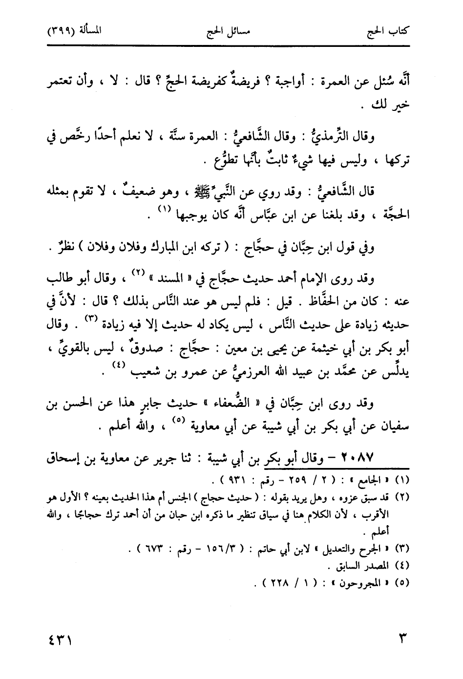 (2) قد سبق عزوه، وهل يريد بقوله: (حديث حجاج) الجنس أم هذا الحديث بعينه؟ الأول هو الأقرب، لأن الكلام هنا في سياق تنظير ما ذكره ابن حبان من أن أحمد ترك حجاجًا، والله أعلم.