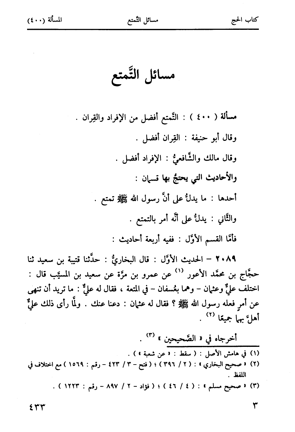 2089 - الحديث الأوَّل: قال البخاريُّ: حدَّثنا قتيبة بن سعيد ثنا حجَّاج بن محمَّد الأعور (1) عن عمرو بن مرَّة عن سعيد بن المسيَّب قال: اختلف عليٌّ وعثمان- وهما بعُسفان- في المتعة، فقال له عليٌّ: ما تريد أن تنهى