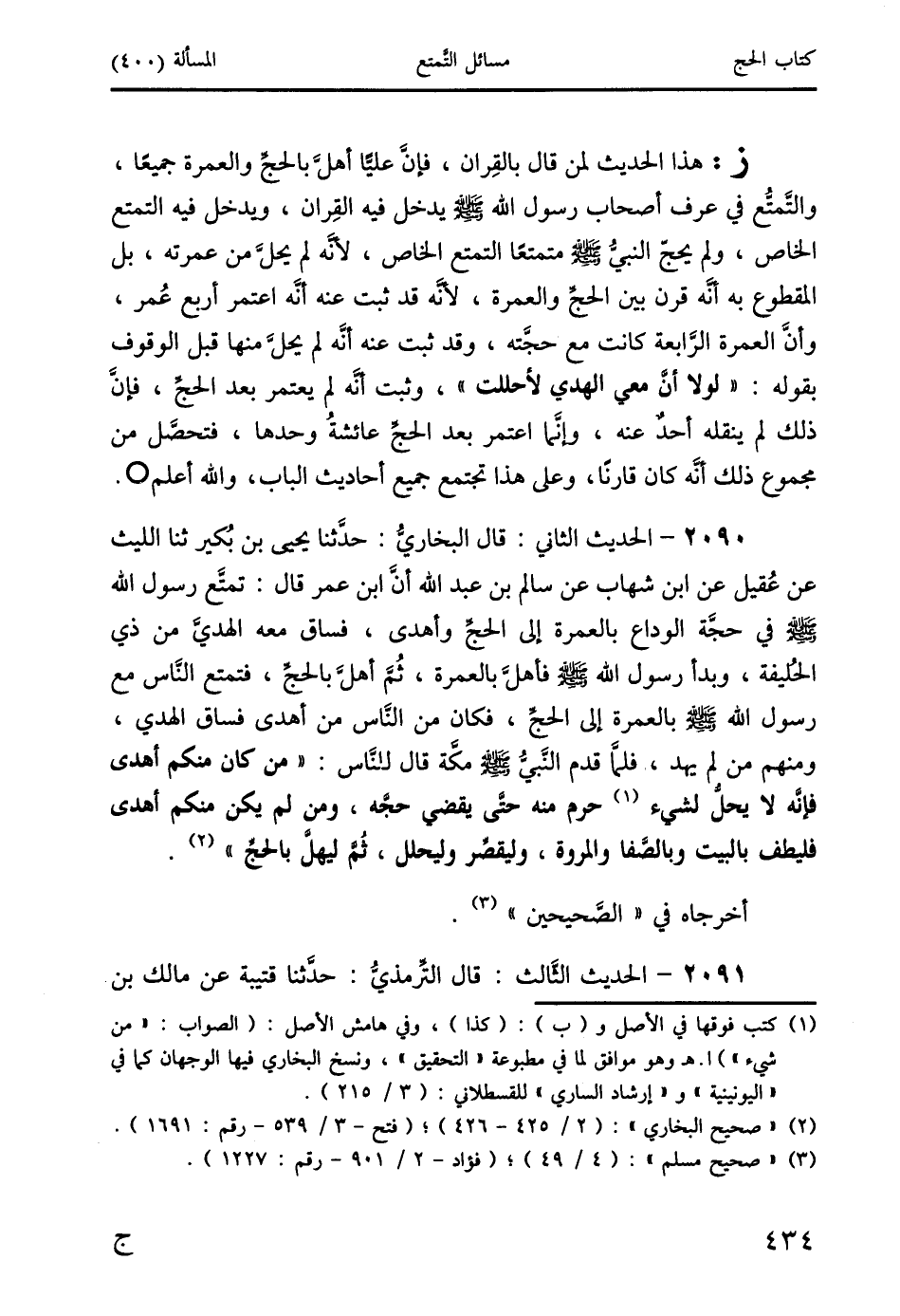 2090 - الحديث الثاني: قال البخاريُّ: حدَّثنا يحيى بن بُكير ثنا الليث عن عُقيل عن ابن شهاب عن سالم بن عبد الله أنَّ ابن عمر قال: تمتَّع رسول الله -صَلَّى اللَّهُ عَلَيْهِ وَسَلَّمَ في حجَّة الوداع بالعمرة الى الحجِّ وأهدى، فساق معه الهديَّ من ذي الحُليفة، وبدأ رسول الله صَلَّى اللَّهُ عَلَيْهِ وَسَلَّمَ فأهلَّ بالعمرة، ثُمَّ أهلَّ بالحجِّ، فتمتع النَّاس مع