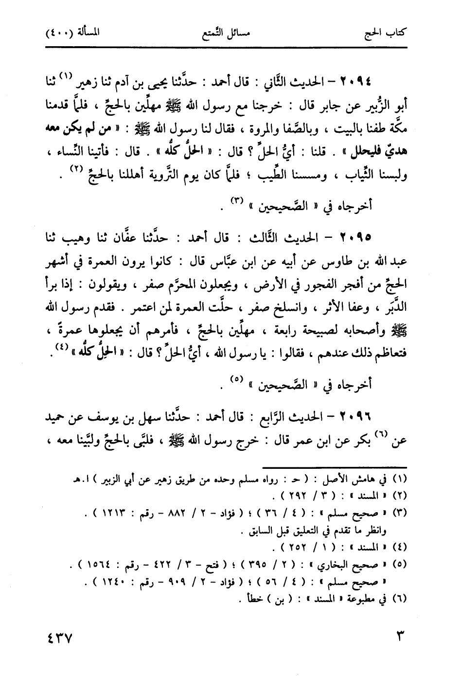 2094 - الحديث الثَّاني: قال أحمد: حدَّثنا يحيى بن آدم ثنا زهير (1) ثنا أبو الزُّبير عن جابر قال: خرجنا مع رسول الله - صَلَّى اللَّهُ عَلَيْهِ وَسَلَّمَ مهلِّين بالحجِّ، فلمَّا قدمنا مكَّة طفنا بالبيت، وبالصَّفا والمروة، فقال لنا رسول الله صَلَّى اللَّهُ عَلَيْهِ وَسَلَّمَ: " من لم يكن معه هديٌ فليحلل ". قلنا: أيُّ الحلِّ؟ قال: " الحلُّ كلُّه ". قال: فأتينا النِّساء،