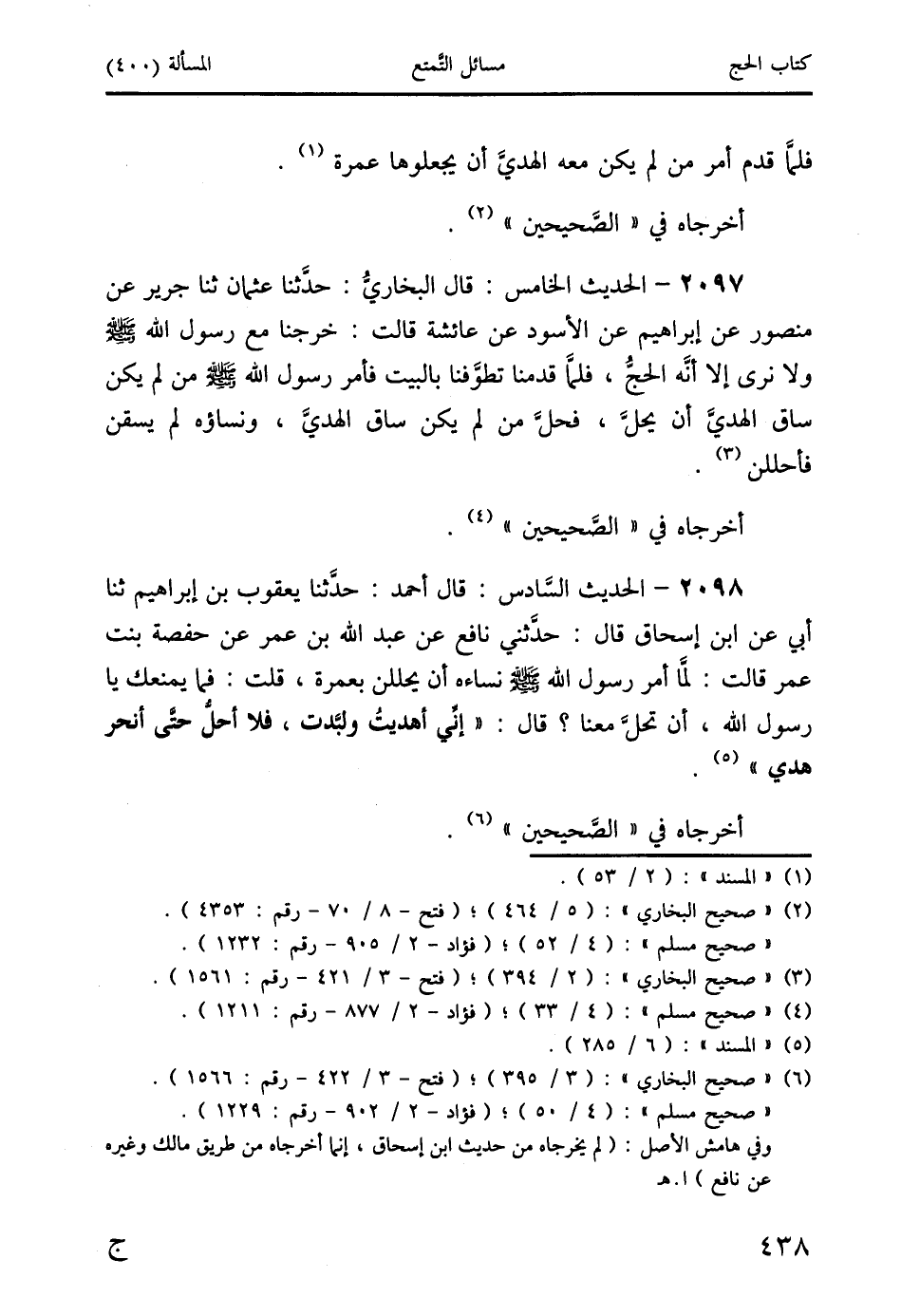 2097 - الحديث الخامس: قال البخاريُّ: حدَّثنا عثمان ثنا جرير عن منصور عن إبراهيم عن الأسود عن عائشة قالت: خرجنا مع رسول الله-صَلَّى اللَّهُ عَلَيْهِ وَسَلَّمَ ولا نرى إلا أنَّه الحجُّ، فلمَّا قدمنا تطوَّفنا بالبيت فأمر رسول الله صَلَّى اللَّهُ عَلَيْهِ وَسَلَّمَ من لم يكن ساق الهديَّ أن يحلَّ، فحلَّ من لم يكن ساق الهديَّ، ونساؤه لم يسقن