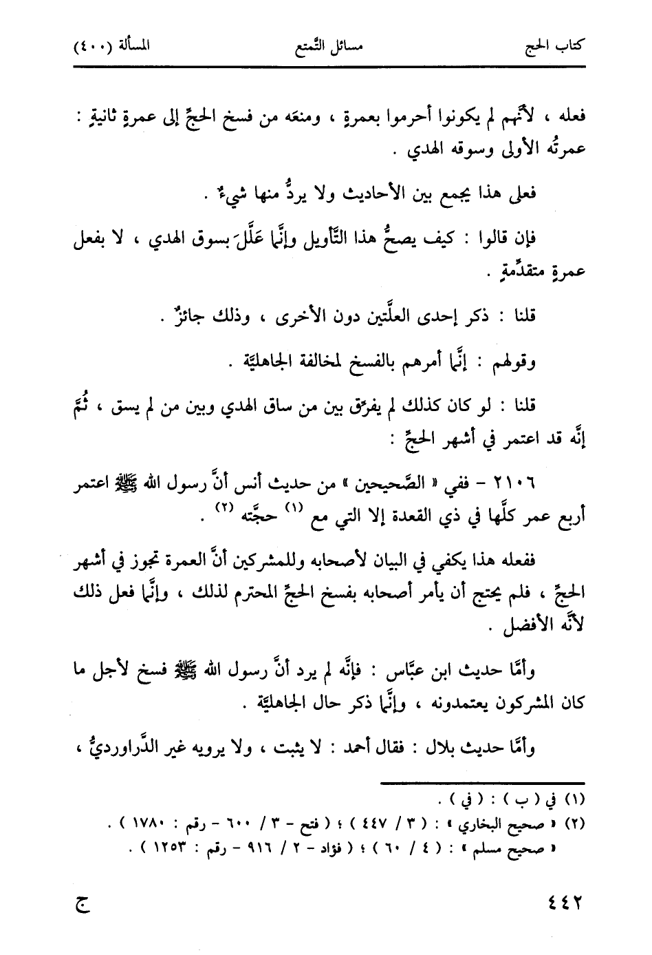 2106 - ففي "الصَّحيحين" من حديث أنس أنَّ رسول الله صَلَّى اللَّهُ عَلَيْهِ وَسَلَّمَ اعتمر أربع عمر كلَّها في ذي القعدة إلا التي مع (1) حجَّته (2).