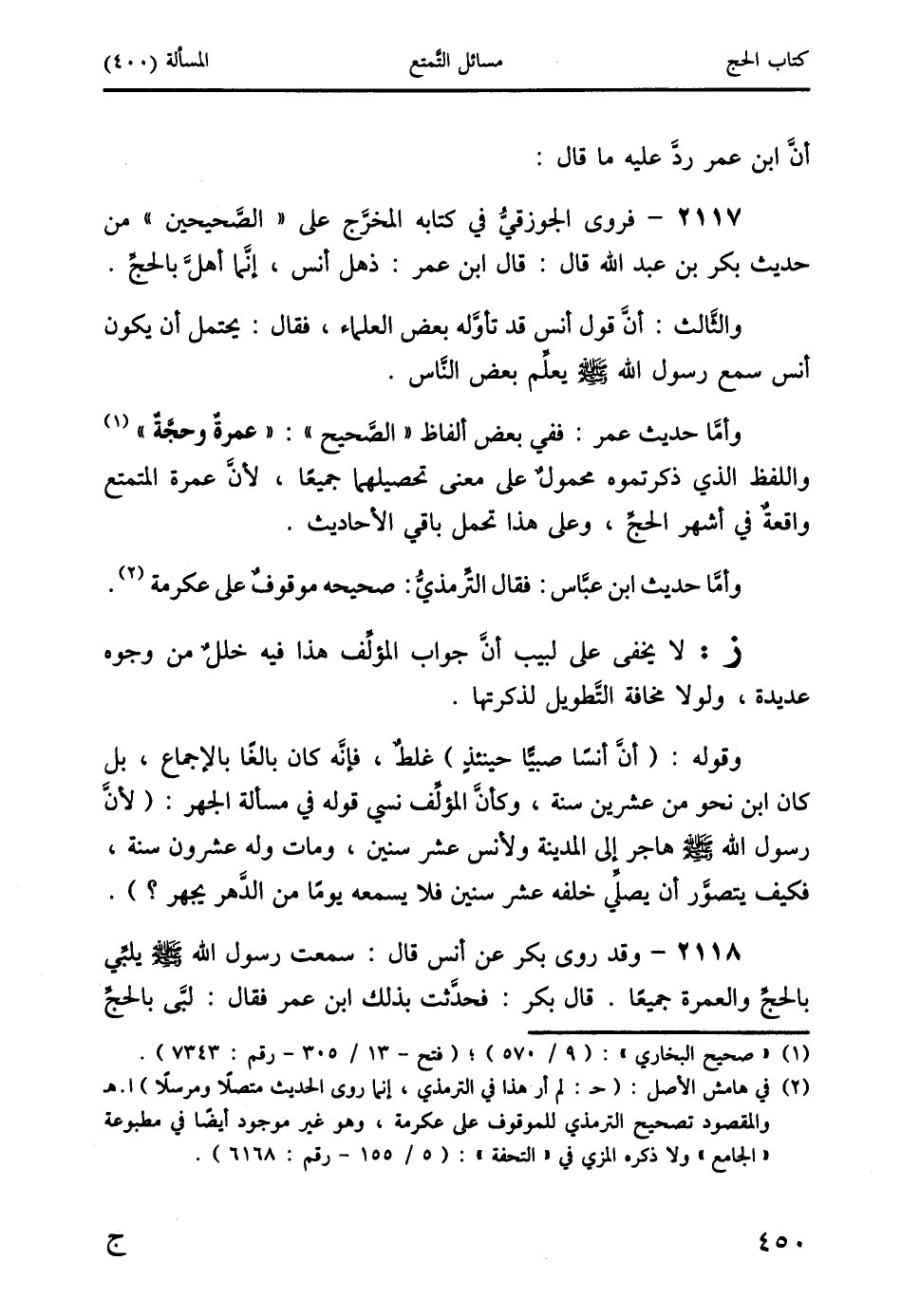 2117 - فروى الجوزقيُّ في كتابه المخرَّج على "الصَّحيحين" من حديث بكر بن عبد الله قال: قال ابن عمر: ذهل أنس، إنَّما أهلَّ بالحجِّ.