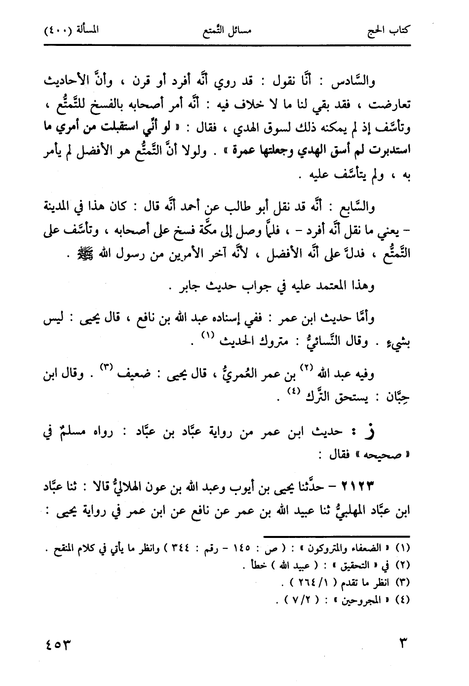 والسَّابع: أنَّه قد نقل أبو طالب عن أحمد أنَّه قال: كان هذا في المدينة - يعني ما نقل أنَّه أفرد-، فلمَّا وصل إلى مكَّة فسخ على أصحابه، وتأسَّف على التَّمتُّع، فدلَّ على أنَّه الأفضل، لأنَّه آخر الأمرين من رسول الله صَلَّى اللَّهُ عَلَيْهِ وَسَلَّمَ.