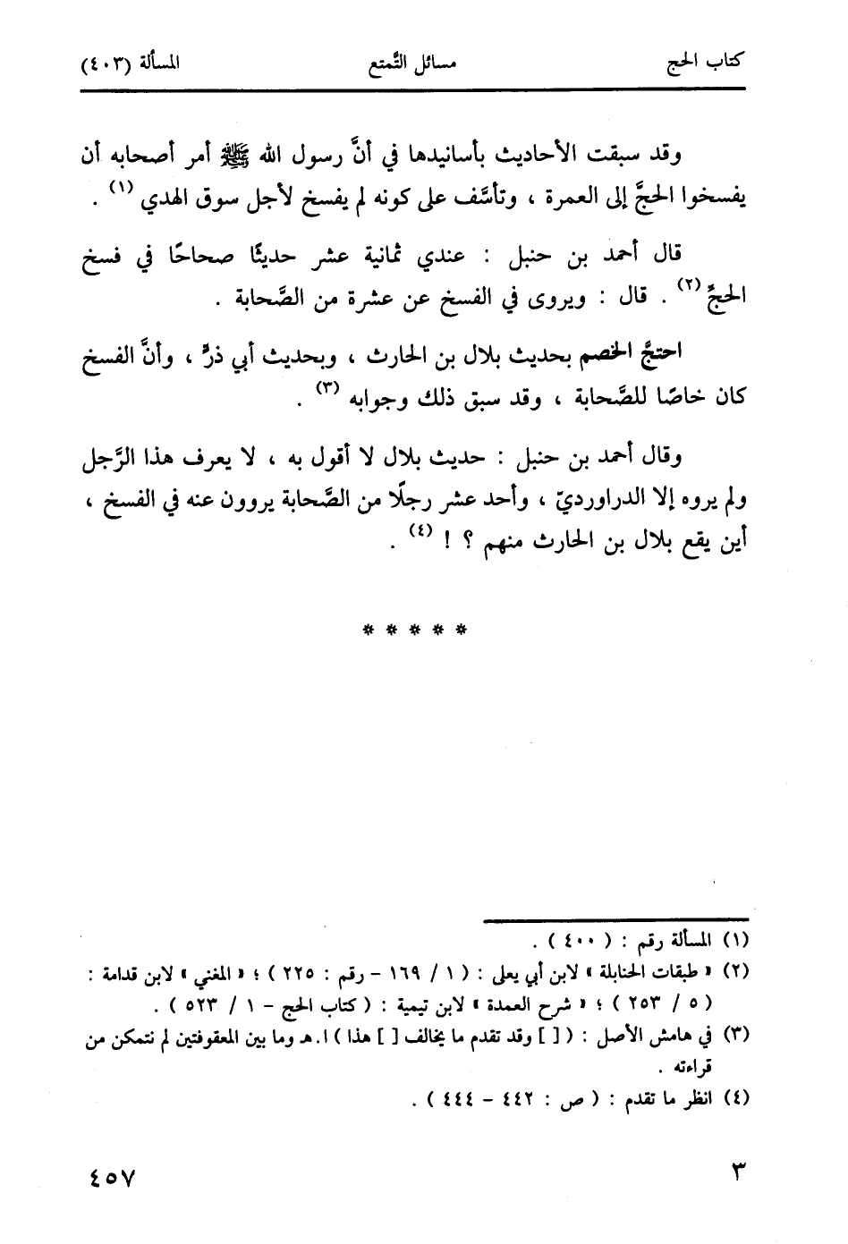 قال أحمد بن حنبل: عندي ثمانية عشر حديثًا صحاحًا في فسخ الحجِّ (2). قال: ويروى في الفسخ عن عشرة من الصَّحابة.