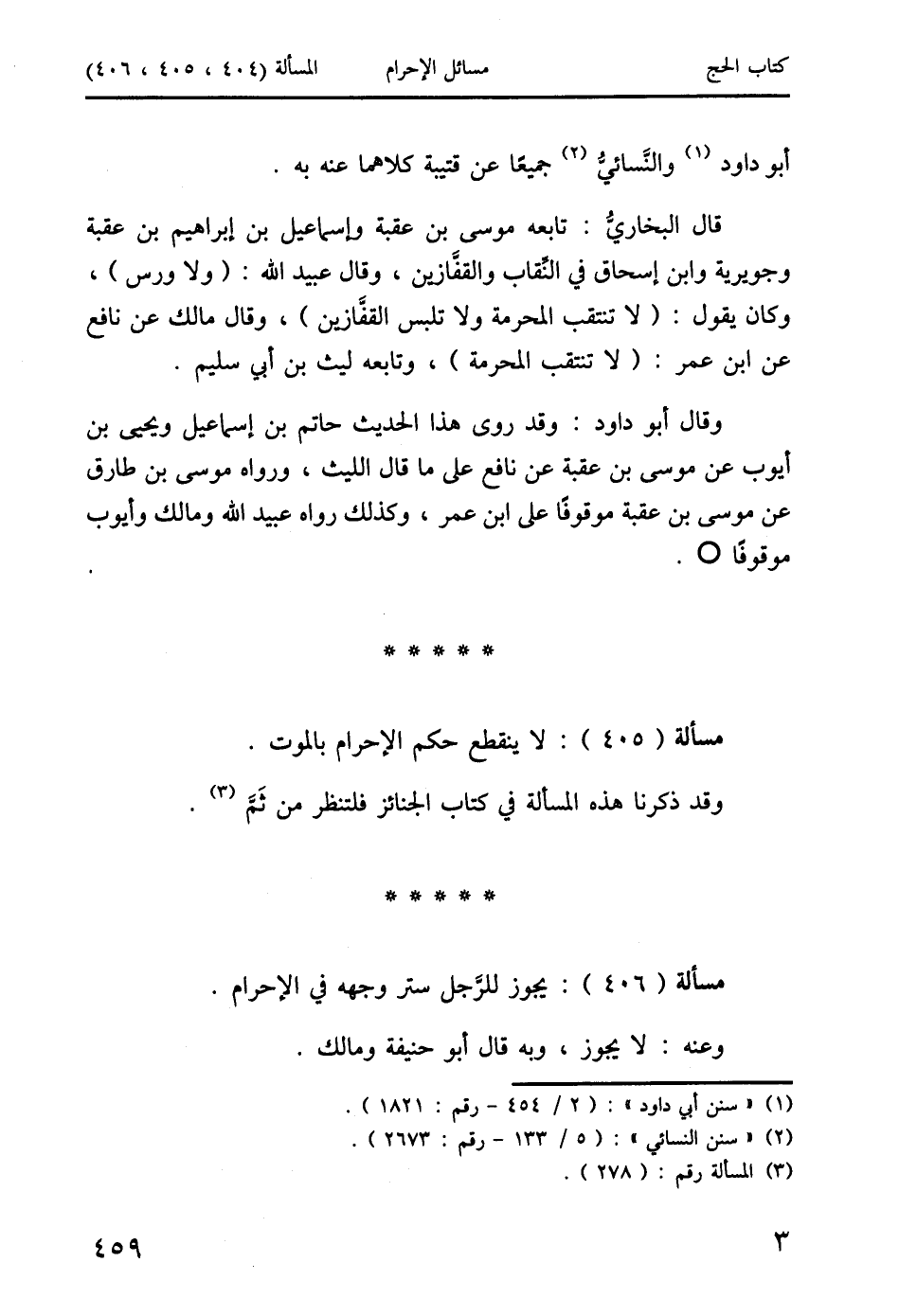 قال البخاريُّ: تابعه موسى بن عقبة وإسماعيل بن إبراهيم بن عقبة وجويرية وابن إسحاق في النِّقاب والقفَّازين، وقال عبيد الله: (ولا ورس)، وكان يقول: (لا تنتقب المحرمة ولا تليس القفَّازين)، وقال مالك عن نافع
