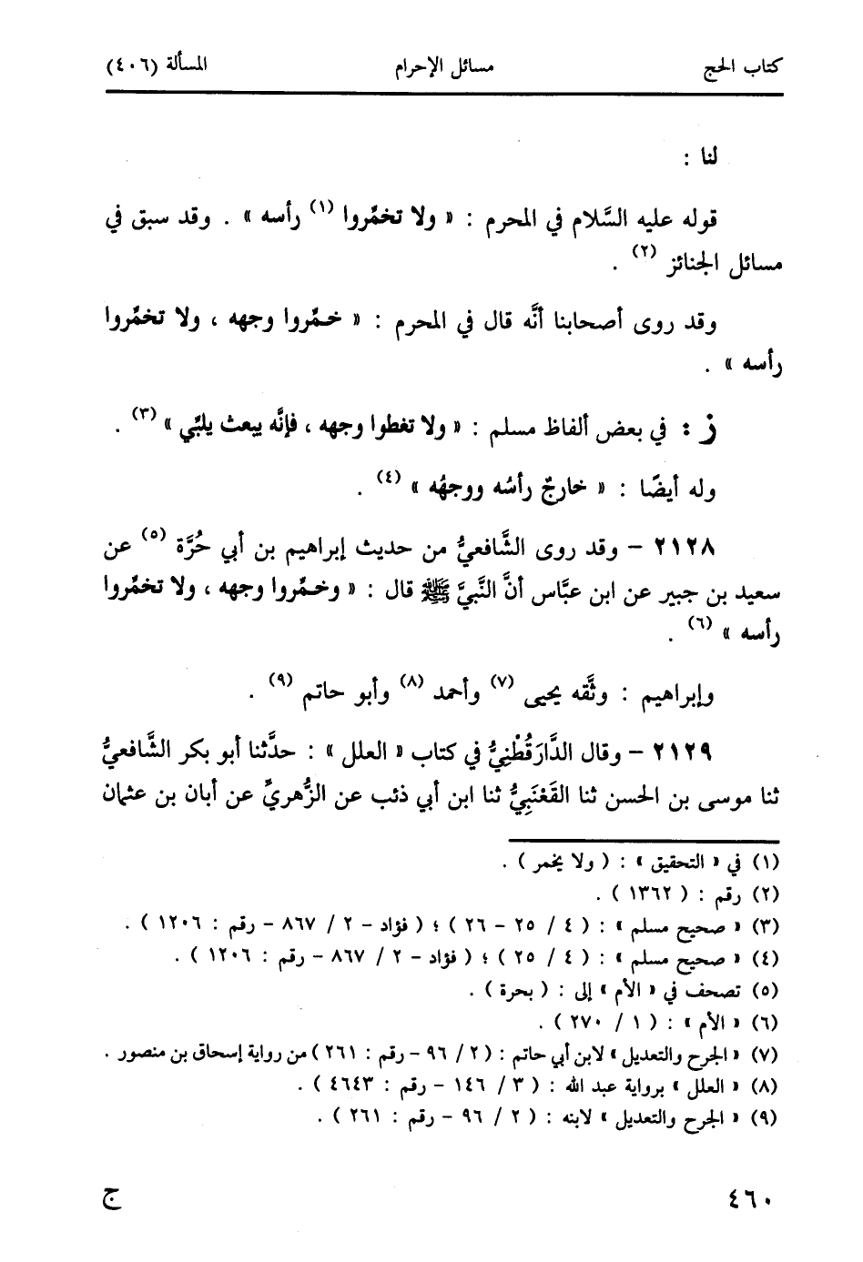 2128 - وقد روى الشَّافعيُّ من حديث إبراهيم بن أبي حُرَة (5) عن سعيد بن جبير عن ابن عبَّاس أنَّ النَّبيَّ صَلَّى اللَّهُ عَلَيْهِ وَسَلَّمَ قال: " وخمِّروا وجهه، ولا تخمِّروا رأسه " (6).