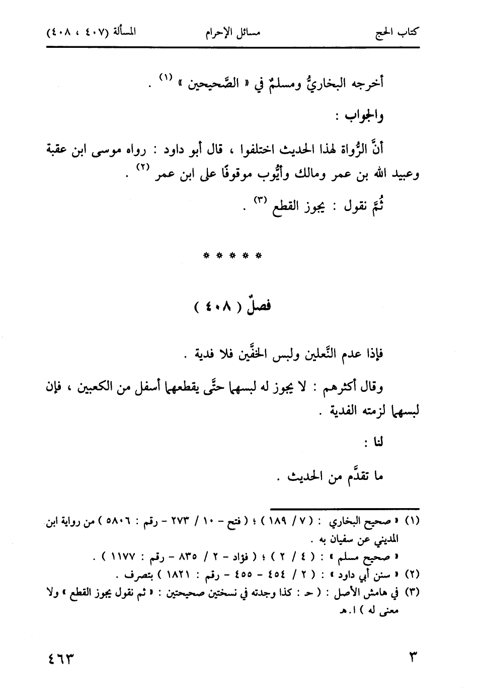 فصلٌ (408): فإذا عدم النَّعلين ولبس الخفَّين فلا فدية.