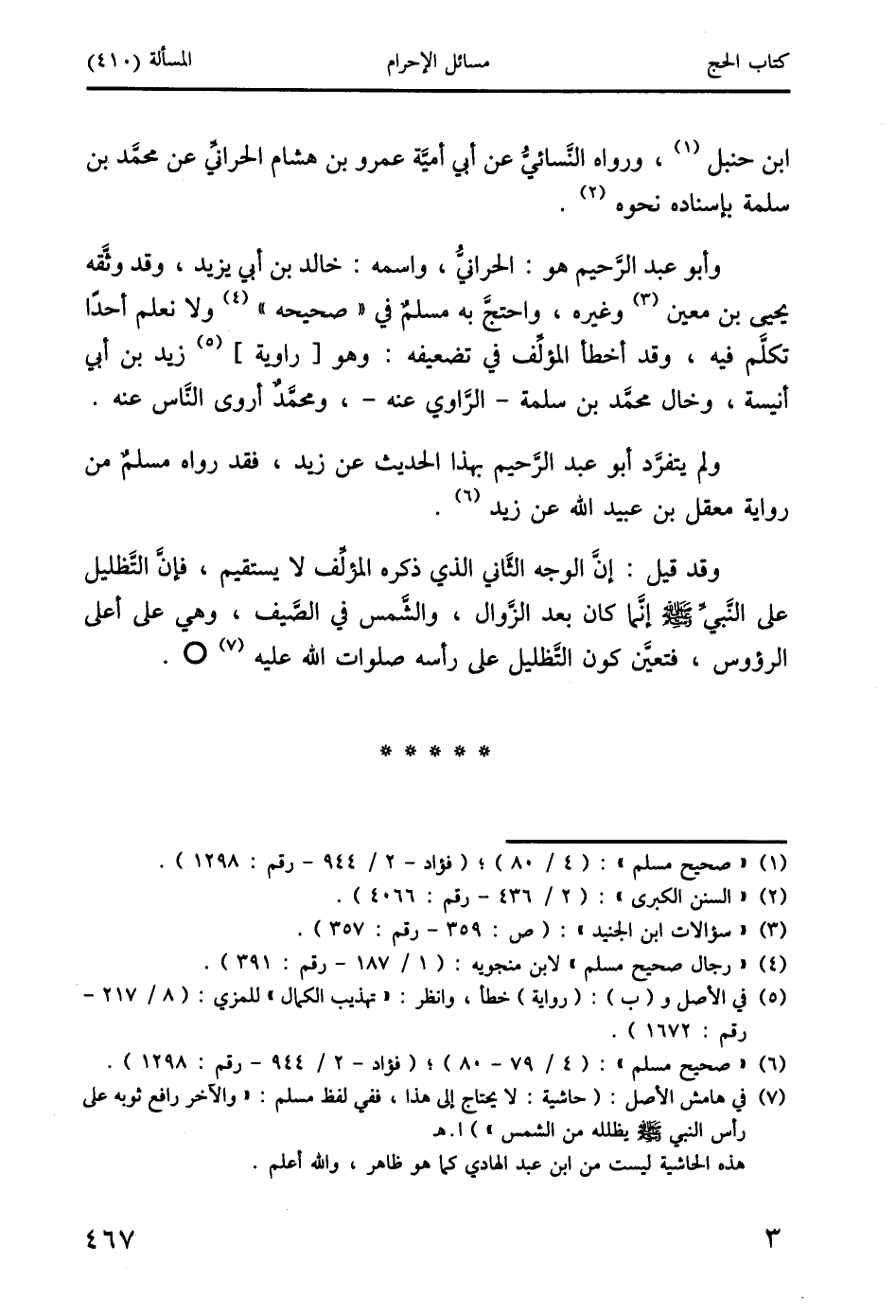 (7) في هامش الأصل: (حاشية: لا يحتاج إلى هذا، ففي لفظ مسلم: " والآخر رافع ثوبه على رأس النبي صَلَّى اللَّهُ عَلَيْهِ وَسَلَّمَ يظلله من الشمس ") ا. هـ