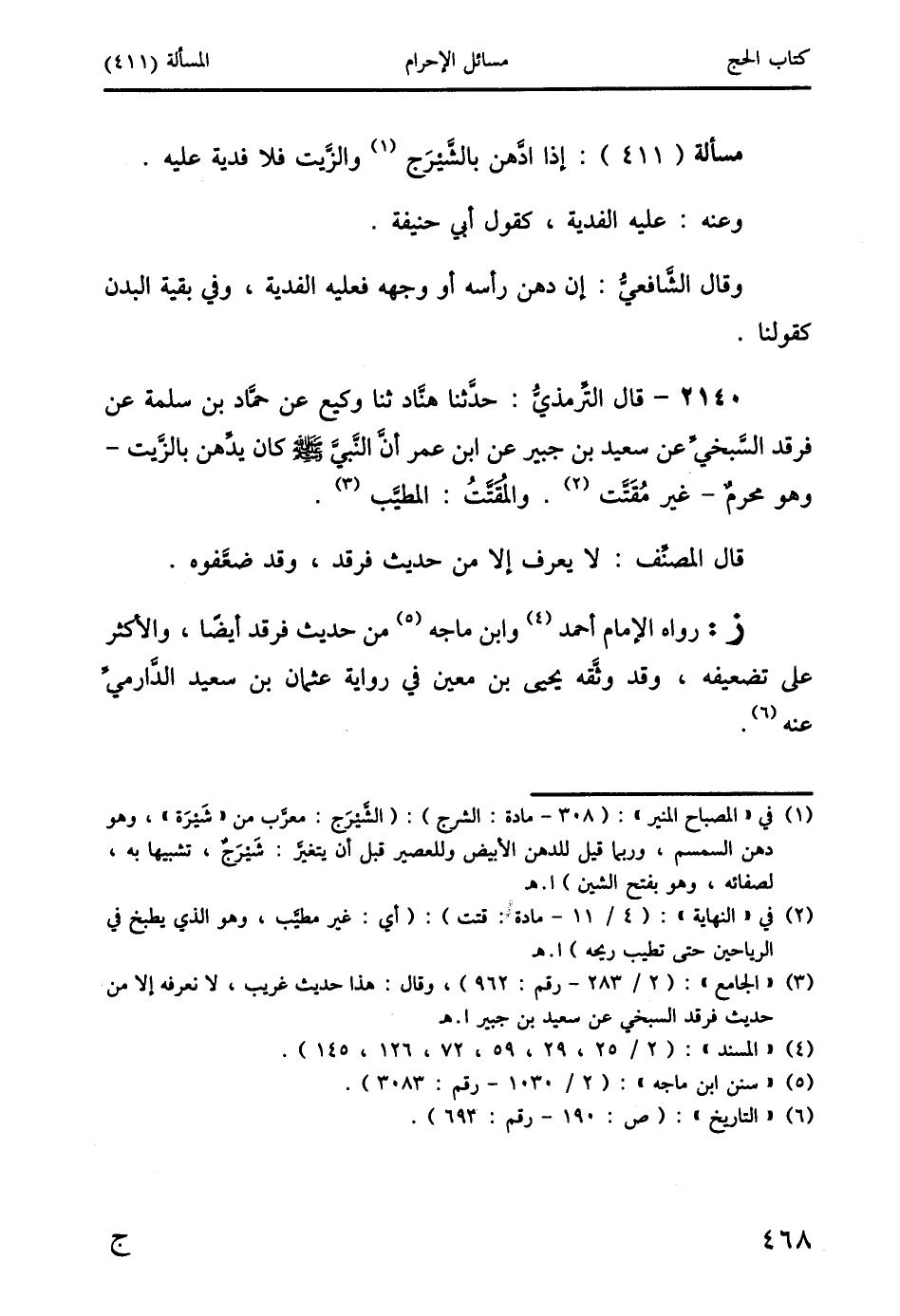 2140 - قال التَّرمذيًّ: حدَّثنا هنَّاد ثنا وكيع عن حمَّاد بن سلمة عن فرقد السَّبخيِّ عن سعيد بن جبير عن ابن عمر أنَّ النَّبيَّ صَلَّى اللَّهُ عَلَيْهِ وَسَلَّمَ كان يدّهن بالزَّيت- وهو محرمٌ- غير مُقَتَّت (2). والمُقَتَّتُ: المطيَّب (3).