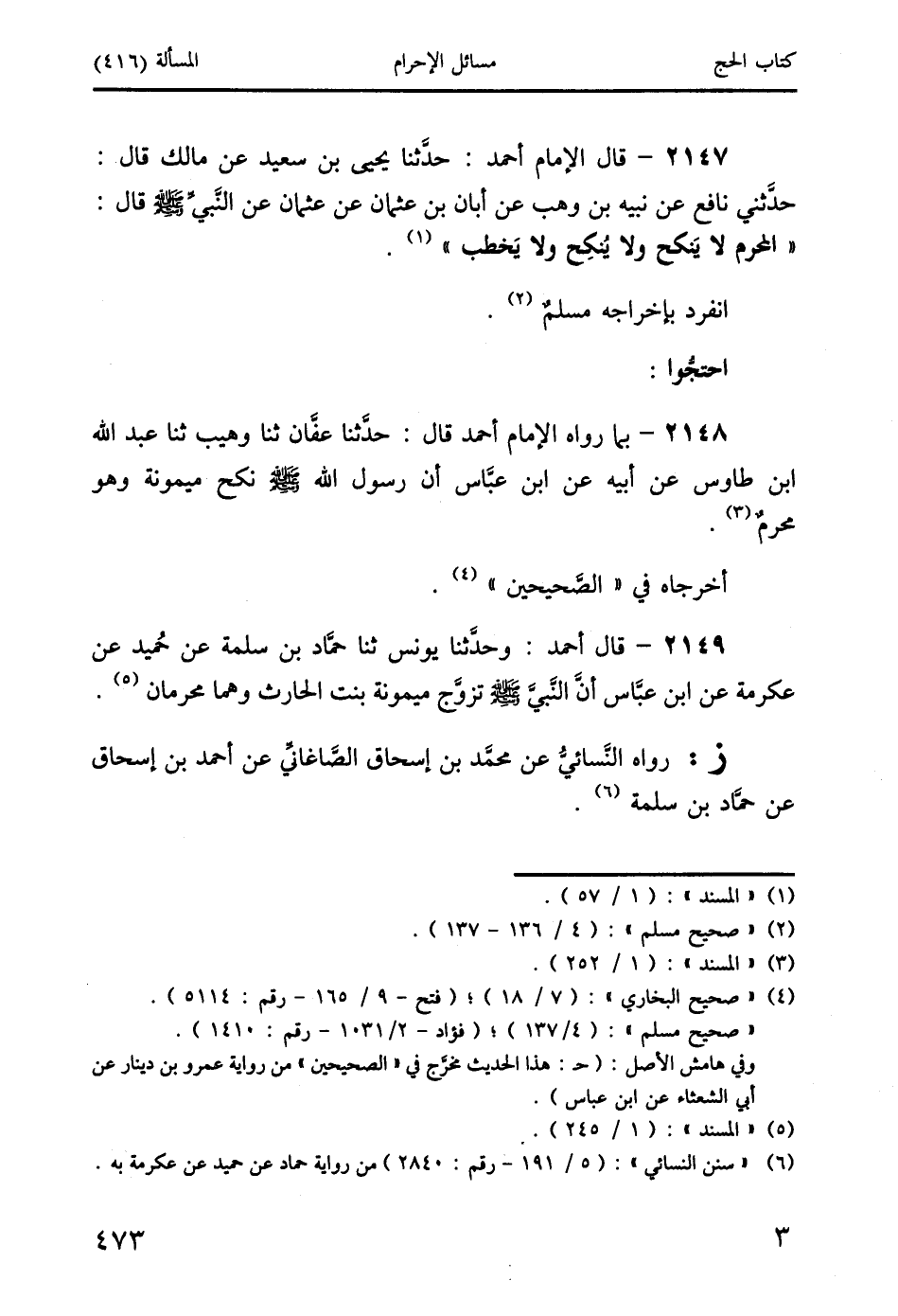 2148 - بما رواه الإمام أحمد قال: حدَّثنا عفَّان ثنا وهيب ثنا عبد الله ابن طاوس عن أبيه عن ابن عبَّاس أن رسول الله صَلَّى اللَّهُ عَلَيْهِ وَسَلَّمَ نكح ميمونة وهو محرمٌ (3).