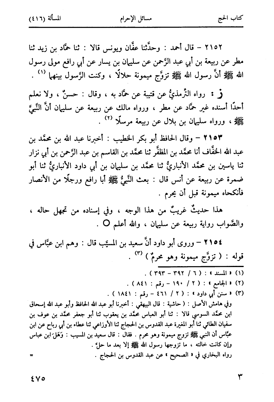 وفي هامش الأصل: (حاشية: قال البيهقي: أخبرنا أبو عبد الله الحافظ وأبو عبد الله إسحاق ابن محمَّد السوسي قالا: ثنا أبو العبَّاس محمَّد بن يعقوب ثنا أبو جعفر محمَّد بن عوف بن سفيان الطائي ثنا أبو المغيرة عبد القدوس بن الحجاج ثنا الأوزاعي ثنا عطاء بن أبي رباح عن ابن عبَّاس أن النبي صَلَّى اللَّهُ عَلَيْهِ وَسَلَّمَ تزوج ميمونة وهو محرم. فقال: قال سعيد بن المسب: وَهَلَ ابن عبَّاس وإن كانت خالته، ما تزوجها رسول الله صَلَّى اللَّهُ عَلَيْهِ وَسَلَّمَ إلا بعد ما حلَّ.