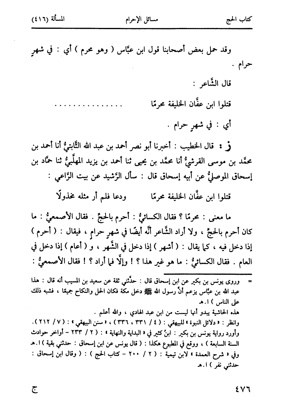 قتلوا ابن عفان الخليفة محرمًا ودعا فلم أر مثله مخذولاً ما معنى: محرمًا؟ فقال الكسائيُّ: أحرم بالحجِّ. فقال الأصمعيُّ: ما كان أحرم بالحجِّ، ولا أراد الشَّاعر أنَّه أيضًا في شهرٍ حرامٍ، فيقال: (أحرم) إذا دخل فيه، كما يقال: (أشهر) إذا دخل في الشَّهر، و (أعام) إذا دخل في العام. فقال الكسائيُّ: ما هو غير هذا؟! وإلا فما أراد؟! فقال الأصمعيُّ: